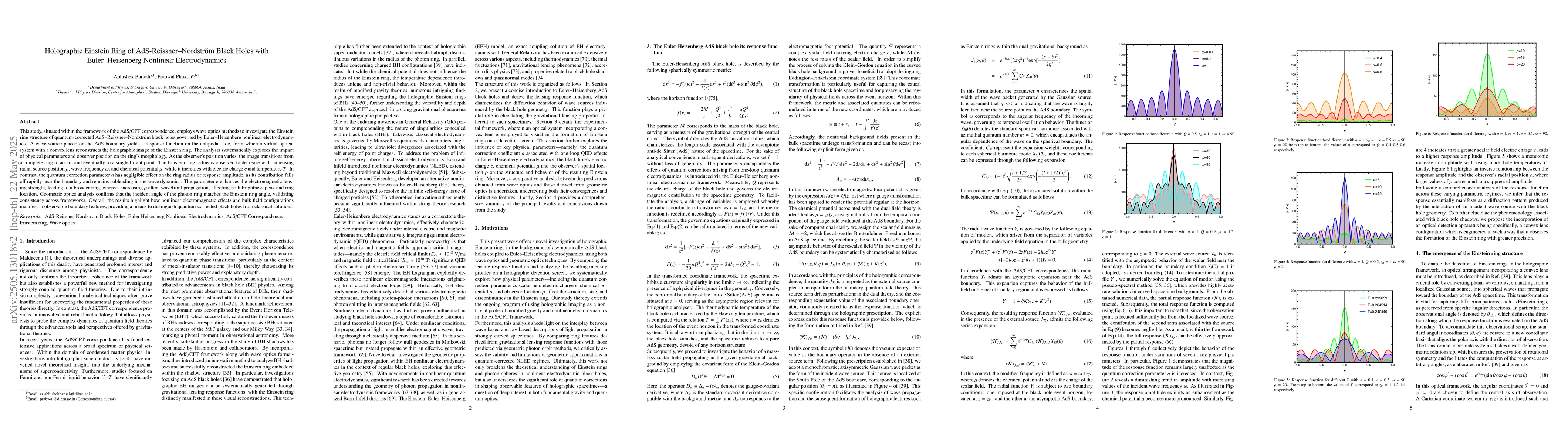 The study uses wave optics methods within the AdS/CFT correspondence framework to analyze the Einstein ring structure of quantum corrected AdS Reissner Nordstr$\ddot{o}$m black holes, governed by Euler Heisenberg nonlinear electrodynamics. A virtual optical system with a convex lens reconstructs the holographic image based on a response function derived from a wave source on the AdS boundary.
