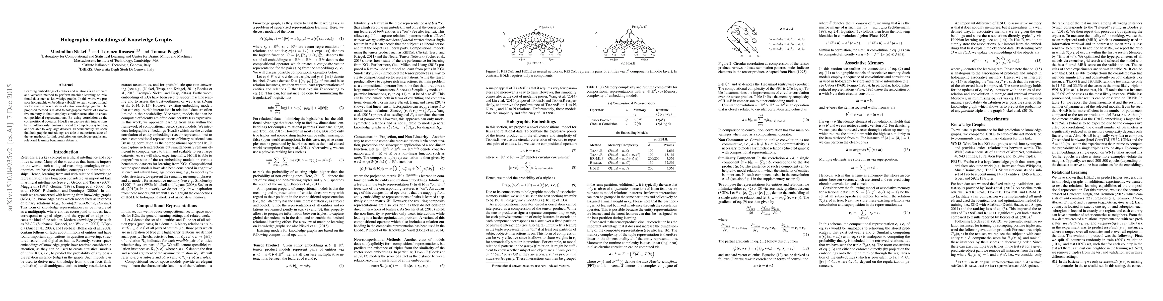 This paper introduces holographic embeddings (HolE) for efficiently learning compositional vector representations of knowledge graphs, using circular correlation to capture interactions while maintaining computational efficiency. HolE outperforms existing methods in link prediction and relational learning tasks.