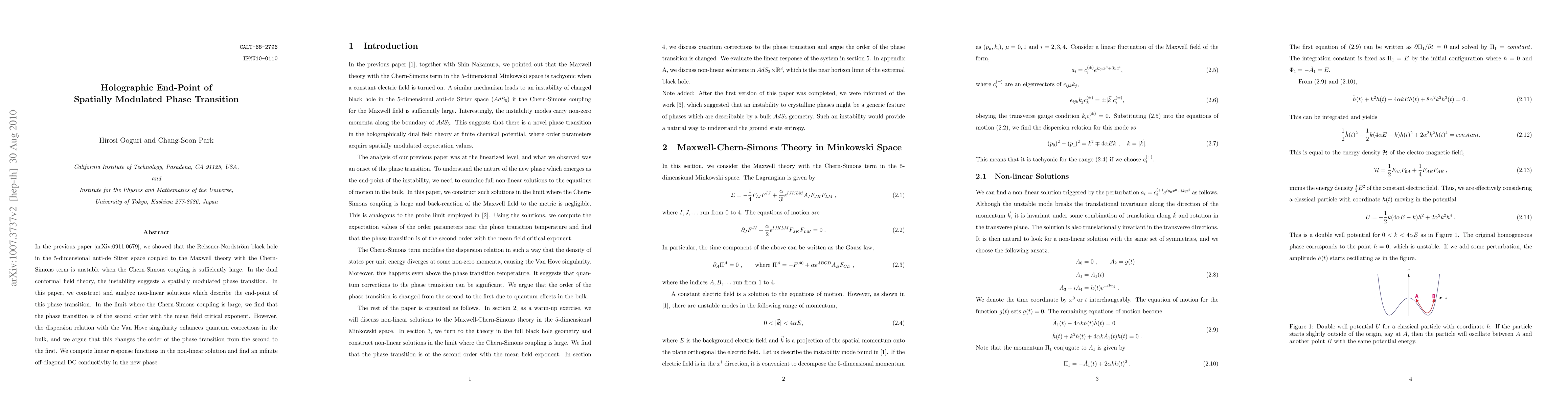 In the previous paper [arXiv:0911.0679], we showed that the Reissner-Nordstrom black hole in the 5-dimensional anti-de Sitter space coupled to the Maxwell theory with the Chern-Simons term is unstable when the Chern-Simons coupling is sufficiently large. In the dual conformal field theory, the instability suggests a spatially modulated phase transition. In this paper, we construct and analyze non-linear solutions which describe the end-point of this phase transition. In the limit where the Chern-Simons coupling is large, we find that the phase transition is of the second order with the mean field critical exponent. However, the dispersion relation with the Van Hove singularity enhances quantum corrections in the bulk, and we argue that this changes the order of the phase transition from the second to the first. We compute linear response functions in the non-linear solution and find an infinite off-diagonal DC conductivity in the new phase.