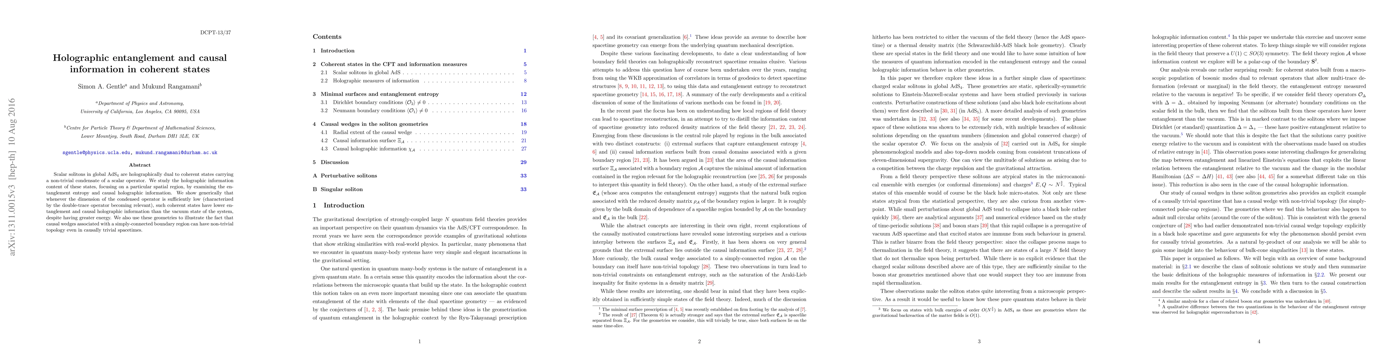 Scalar solitons in global AdS4 are holographically dual to coherent states carrying a non-trivial condensate of a scalar operator. We study the holographic information content of these states, focusing on a particular spatial region, by examining the entanglement entropy and causal holographic information. We show generically that whenever the dimension of the condensed operator is sufficiently low (characterized by the double-trace operator becoming relevant), such coherent states have lower entanglement and causal holographic information than the vacuum state of the system, despite having greater energy. We also use these geometries to illustrate the fact that causal wedges associated with a simply-connected boundary region can have non-trivial topology even in causally trivial spacetimes.
