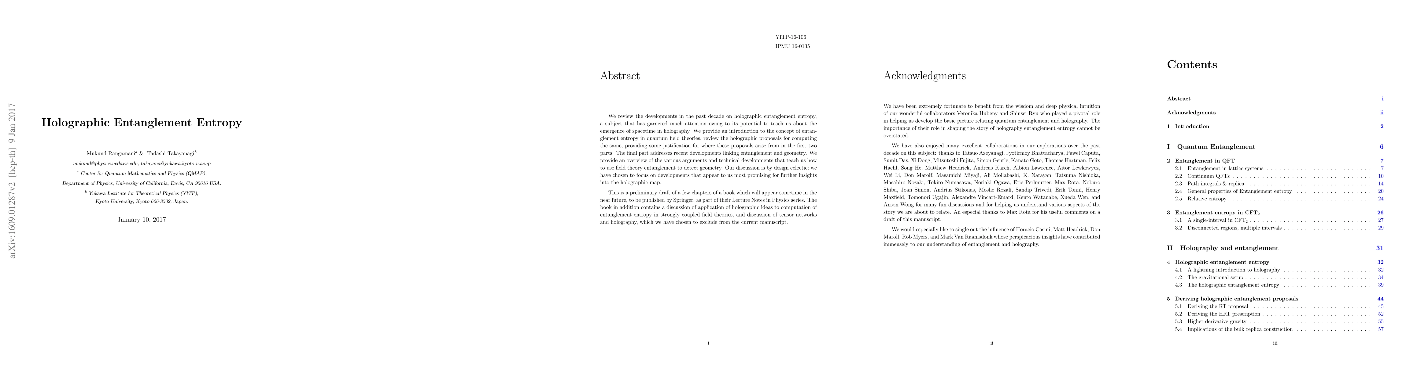 We review the developments in the past decade on holographic entanglement entropy, a subject that has garnered much attention owing to its potential to teach us about the emergence of spacetime in holography. We provide an introduction to the concept of entanglement entropy in quantum field theories, review the holographic proposals for computing the same, providing some justification for where these proposals arise from in the first two parts. The final part addresses recent developments linking entanglement and geometry. We provide an overview of the various arguments and technical developments that teach us how to use field theory entanglement to detect geometry. Our discussion is by design eclectic; we have chosen to focus on developments that appear to us most promising for further insights into the holographic map. This is a draft of a few chapters of a book which will appear sometime in the near future, to be published by Springer. The book in addition contains a discussion of application of holographic ideas to computation of entanglement entropy in strongly coupled field theories, and discussion of tensor networks and holography, which we have chosen to exclude from the current manuscript.