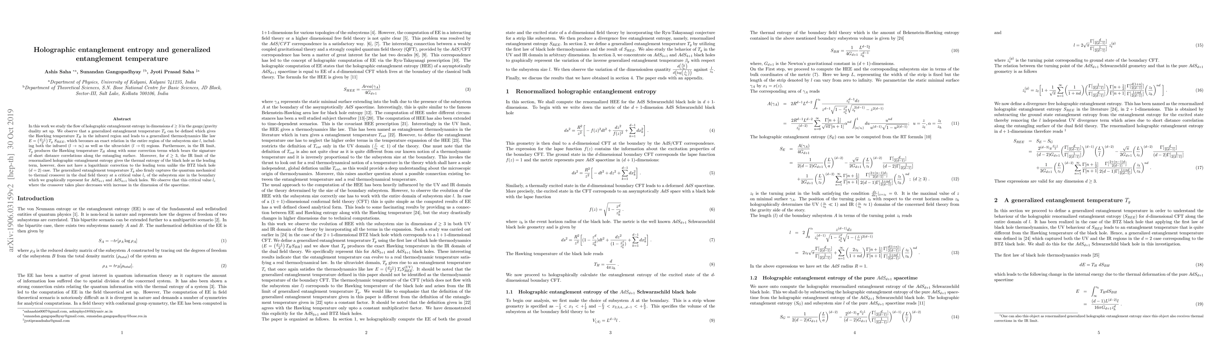 In this work we study the flow of holographic entanglement entropy in dimensions $d \geq 3$ in the gauge/gravity duality set up. We observe that a generalized entanglement temperature $T_g$ can be defined which gives the Hawking temperature $T_H$ in the infrared region and leads to a generalized thermodynamics like law $E= \left(\frac{d-1}{d}\right)T_g~S_{REE}$, which becomes an exact relation in the entire region of the subsystem size $l$, including both the infrared ($l\rightarrow\infty$) as well as the ultraviolet ($l\rightarrow 0$) regions. Furthermore, in the IR limit, $T_g$ produces the Hawking temperature $T_H$ along with some correction terms which bears the signature of short distance correlations along the entangling surface. Moreover, for $d\geq 3$, the IR limit of the renormalized holographic entanglement entropy gives the thermal entropy of the black hole as the leading term, however, does not have a logarithmic correction to the leading term unlike the BTZ black hole ($d=2$) case. The generalized entanglement temperature $T_g$ also firmly captures the quantum mechanical to thermal crossover in the dual field theory at a critical value $l_c$ of the subsystem size in the boundary which we graphically represent for $AdS_{3+1}$ and $AdS_{4+1}$ black holes. We observe that this critical value $l_c$ where the crossover takes place decreases with increase in the dimension of the spacetime.