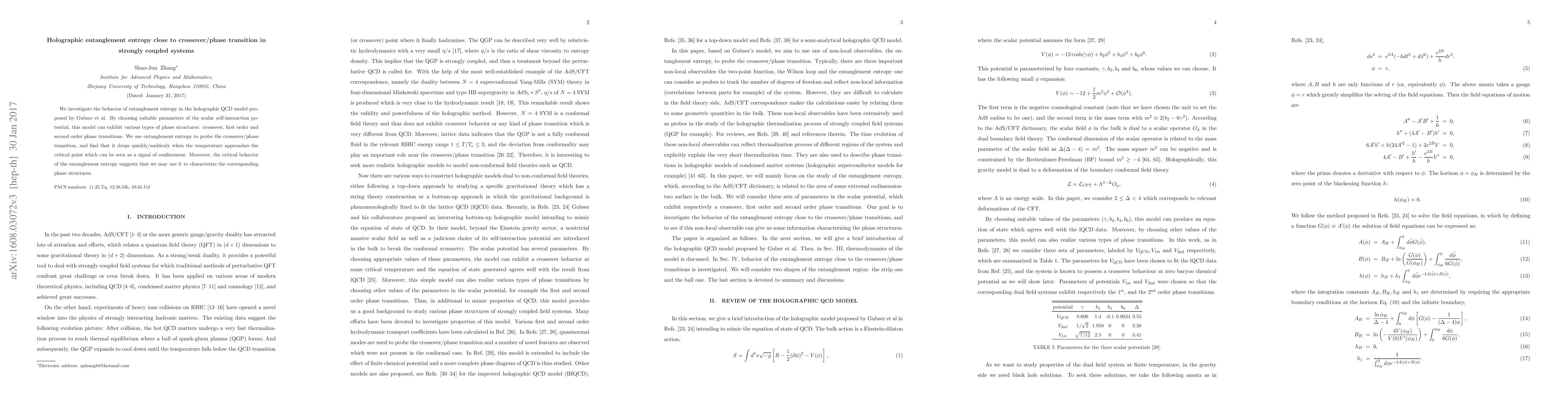 The research investigates entanglement entropy in the holographic QCD model proposed by Gubser et al. using various scalar self-interaction potentials to induce crossover, first-order, and second-order phase transitions.
