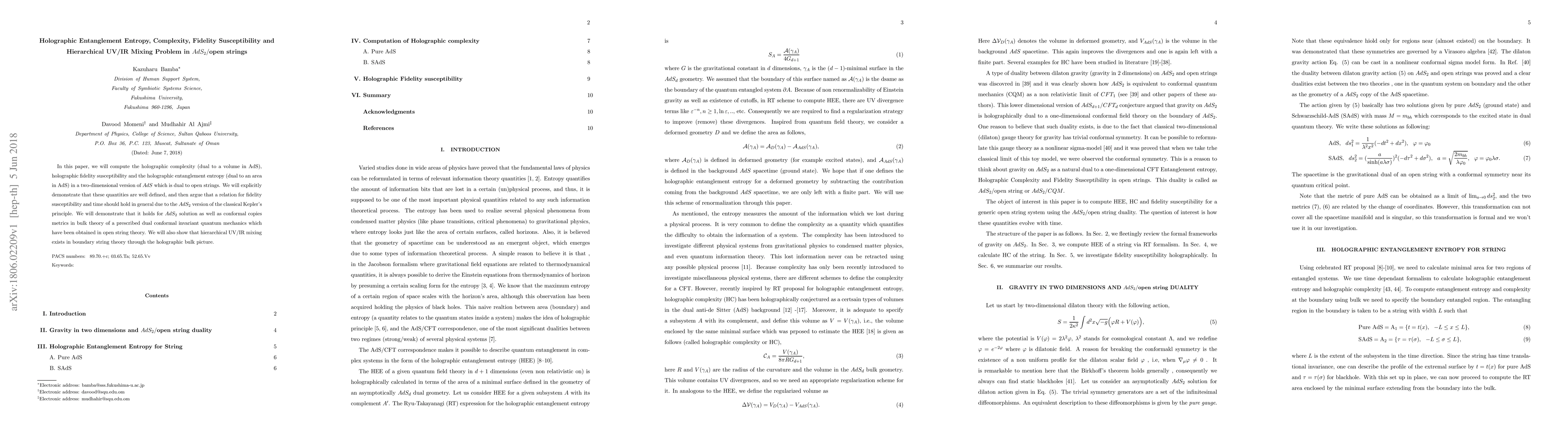 Summary: This paper computes holographic complexity, fidelity susceptibility, and entanglement entropy in 2D AdS dual to open strings, arguing for a general relation between fidelity susceptibility and time based on AdS_2's classical Kepler's principle. It also demonstrates hierarchical UV/IR mixing in boundary string theory via the holographic bulk perspective.