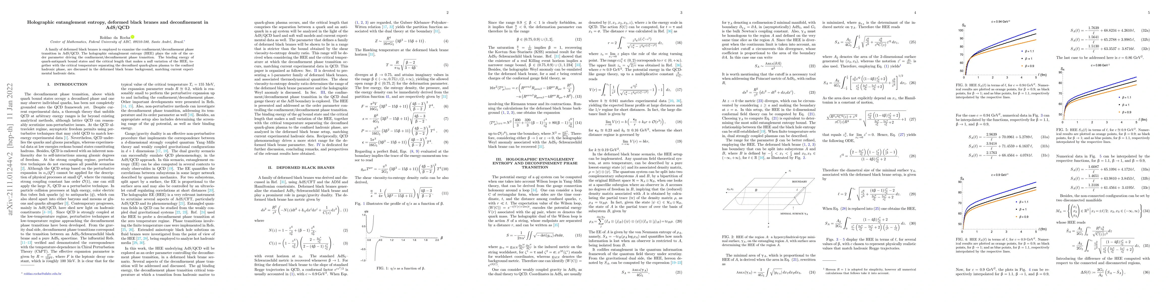 This paper uses deformed black branes in AdS/QCD to study the confinement/deconfinement phase transition, with holographic entanglement entropy acting as the order parameter. It analyzes the binding energy of quark-antiquark pairs and the critical temperature for transitioning from a confined hadronic phase to a deconfined quark-gluon plasma, aligning with experimental data.