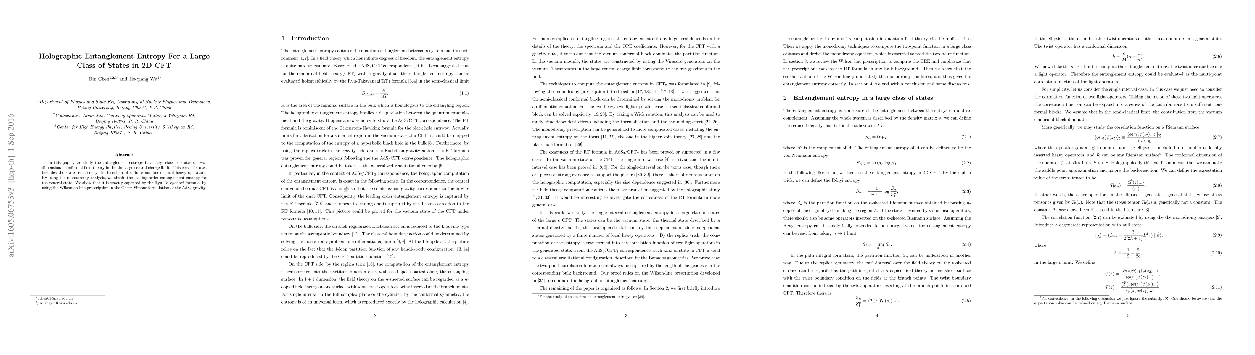 In this paper, we study the entanglement entropy in a large class of states of two-dimensional conformal field theory in the the large central charge limit. This class of states includes the states created by the insertion of a finite number of local heavy operators. By using the monodromy analysis, we obtain the leading order entanglement entropy for the general state. We show that it is exactly captured by the Ryu-Takayanagi formula, by using the Wilsonian line prescription in the Chern-Simons formulation of the AdS$_3$ gravity.