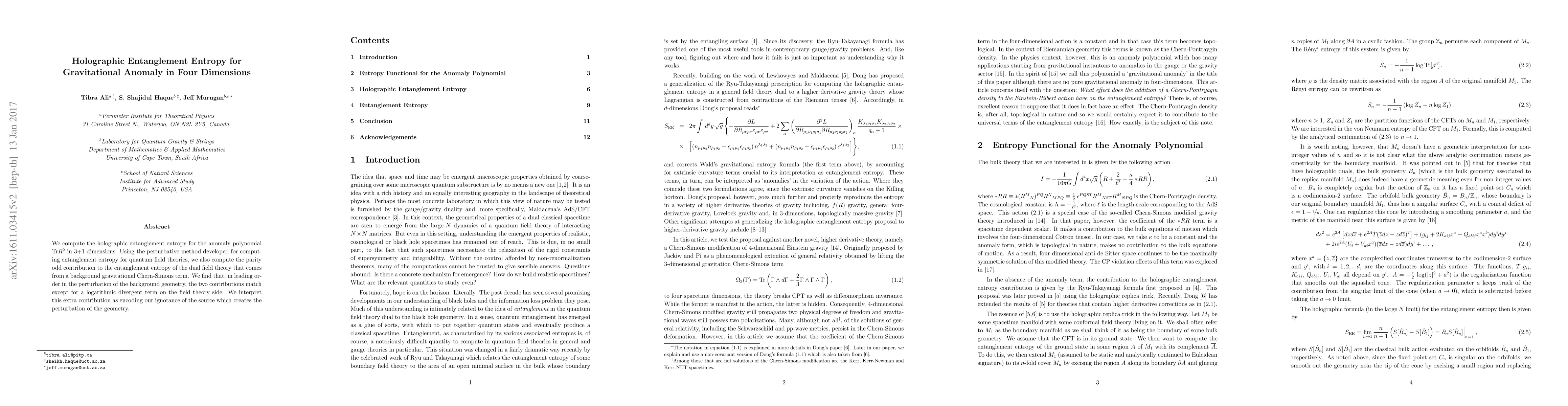 This paper computes holographic entanglement entropy for the anomaly polynomial $\mathrm{Tr} R^2$ in 4D, finding that the entanglement entropy from the dual field theory matches the gravitational contribution except for a logarithmic divergence, which is interpreted as reflecting the lack of knowledge about the geometry perturbation source.