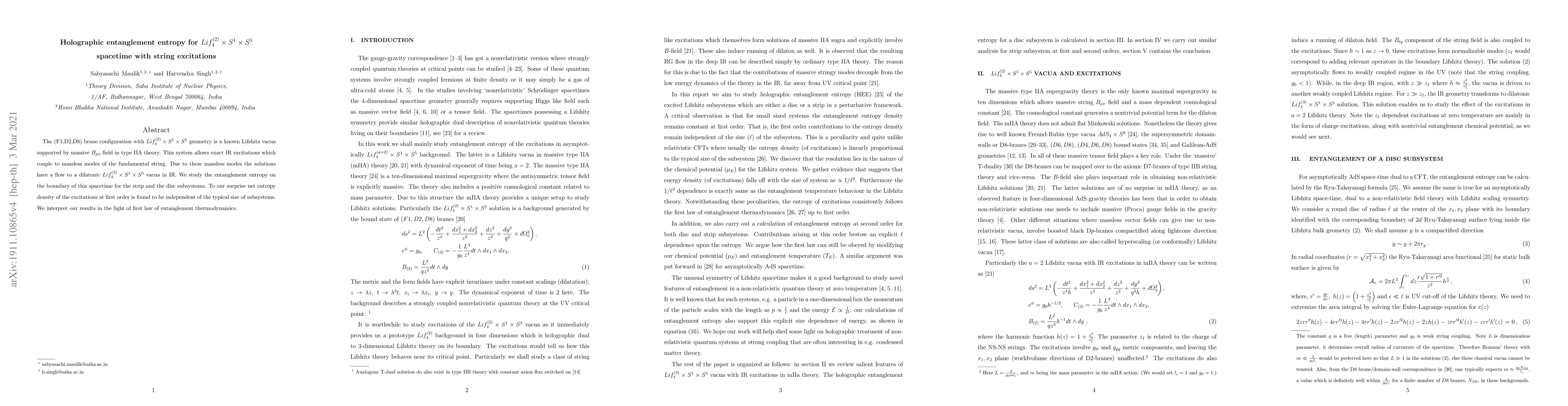 The (F1,D2,D8) brane configuration with $Lif_4^{(2)}\times {S}^1\times S^5$ geometry is a known Lifshitz vacua supported by massive $B_{\mu\nu}$ field in type IIA theory. This system allows exact IR excitations which couple to massless modes of the fundamental string. Due to these massless modes the solutions have a flow to a dilatonic $Lif_4^{(3)}\times S^1\times S^5$ vacua in IR. We study the entanglement entropy on the boundary of this spacetime for the strip and the disc subsystems. To our surprise net entropy density of the excitations at first order is found to be independent of the typical size of subsystems. We interpret our results in the light of first law of entanglement thermodynamics.