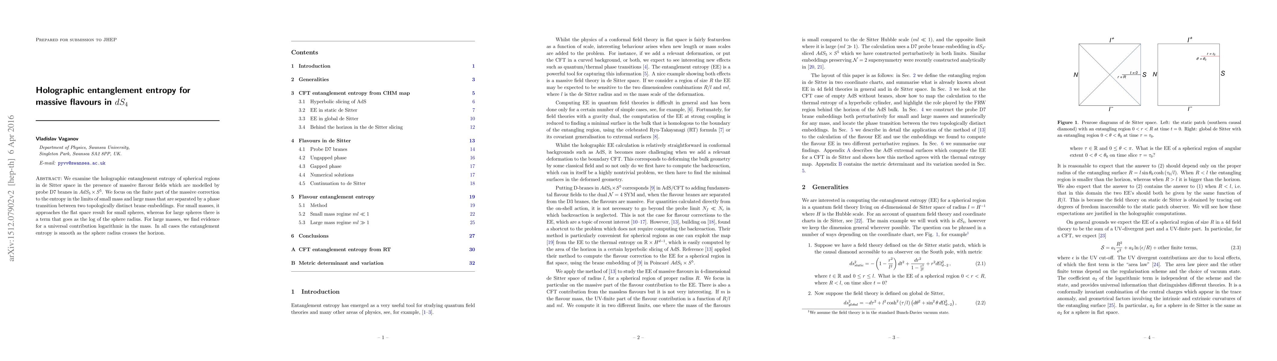The paper presents a detailed holographic computation of the entanglement entropy for massive flavours in dS_4, extending previous work in flat space and AdS. It identifies and analyses the universal logarithmic mass term in the large mass limit.