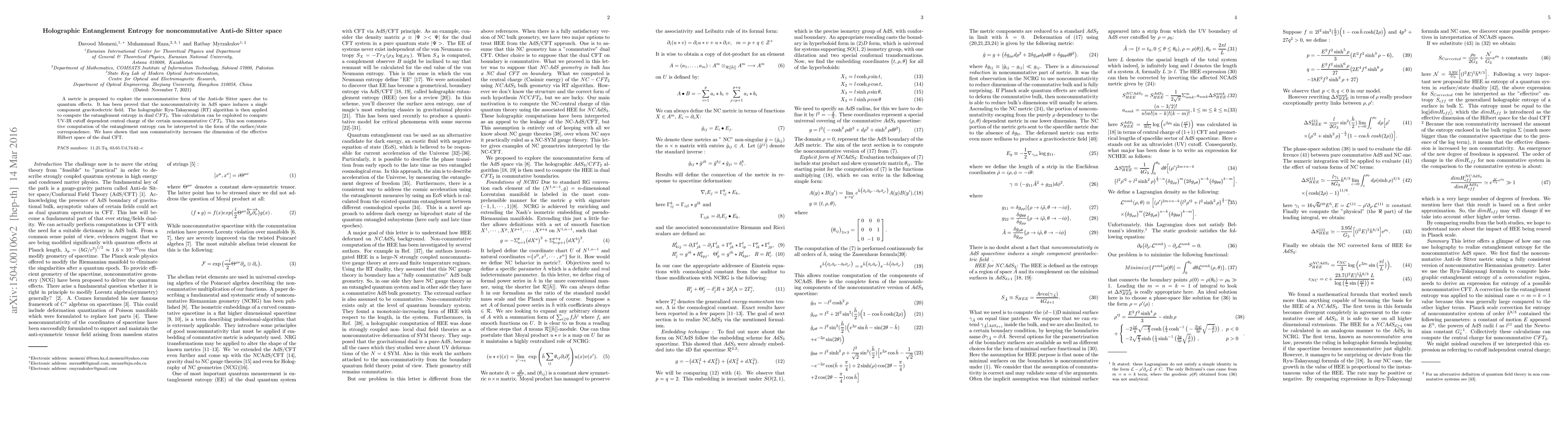 This paper proposes a metric for noncommutative Anti-de Sitter space and demonstrates that noncommutativity induces a gravitoelectric field. Using the holographic Ryu-Takayanagi algorithm, it computes the entanglement entropy in the dual $CFT_2$, revealing an increase in the dimension of the effective Hilbert space due to noncommutativity.