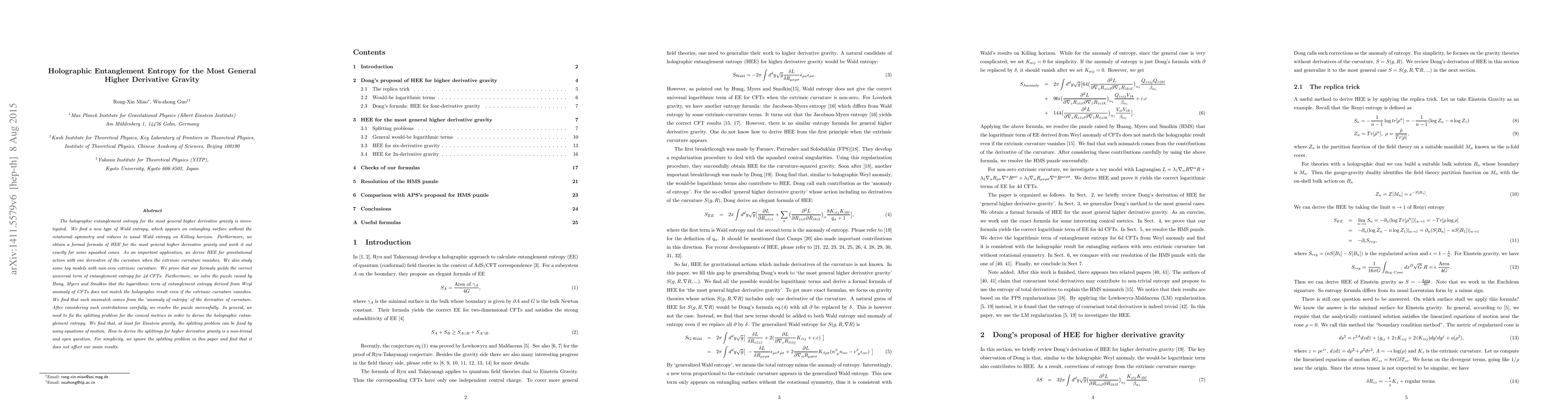 This paper investigates holographic entanglement entropy (HEE) in the context of the most general higher derivative gravity, discovering a novel Wald entropy type on non-rotationally symmetric surfaces. It provides a general formula for HEE and resolves a longstanding puzzle regarding discrepancies between entanglement entropy derived from conformal field theory anomalies and holographic results.