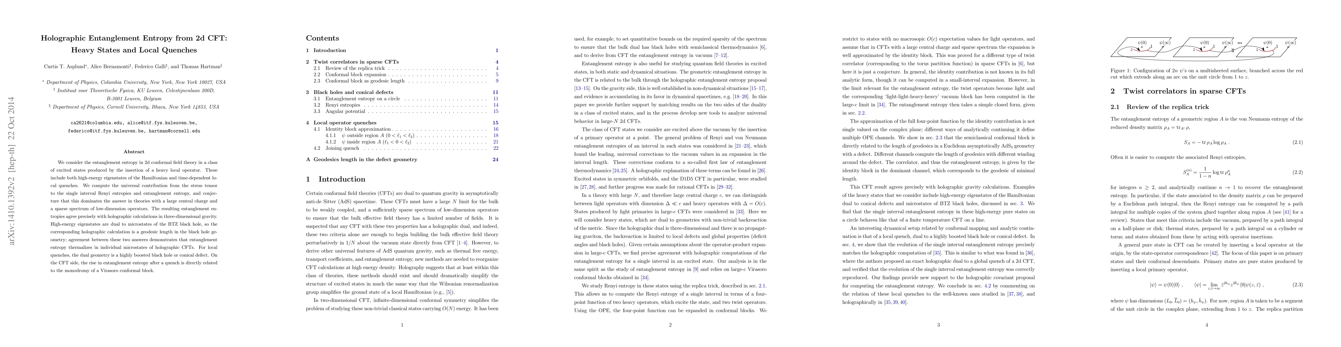 We consider the entanglement entropy in 2d conformal field theory in a class of excited states produced by the insertion of a heavy local operator. These include both high-energy eigenstates of the Hamiltonian and time-dependent local quenches. We compute the universal contribution from the stress tensor to the single interval Renyi entropies and entanglement entropy, and conjecture that this dominates the answer in theories with a large central charge and a sparse spectrum of low-dimension operators. The resulting entanglement entropies agree precisely with holographic calculations in three-dimensional gravity. High-energy eigenstates are dual to microstates of the BTZ black hole, so the corresponding holographic calculation is a geodesic length in the black hole geometry; agreement between these two answers demonstrates that entanglement entropy thermalizes in individual microstates of holographic CFTs. For local quenches, the dual geometry is a highly boosted black hole or conical defect. On the CFT side, the rise in entanglement entropy after a quench is directly related to the monodromy of a Virasoro conformal block.