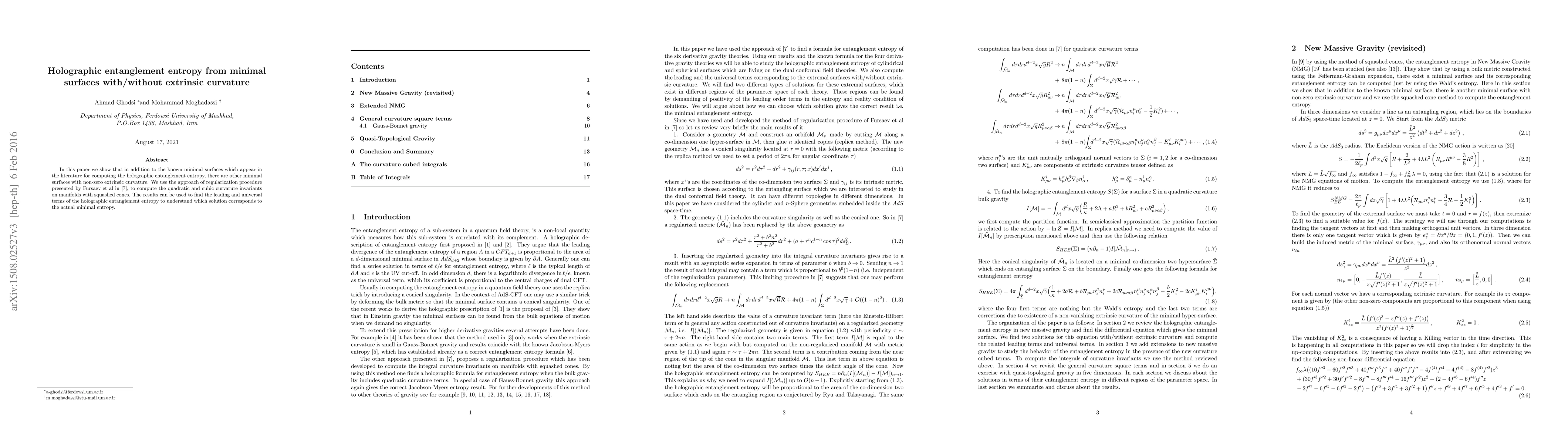 In this paper we show that in addition to the known minimal surfaces which appear in the literature for computing the entanglement entropy there are other minimal surfaces with non-zero extrinsic curvature. We use the approach of regularization procedure for computing the quadratic and cubic curvature invariants on manifolds with squashed cones. The results can be used to find the leading and universal terms of the holographic entanglement entropy to understand which solution corresponds to the actual minimal surface.