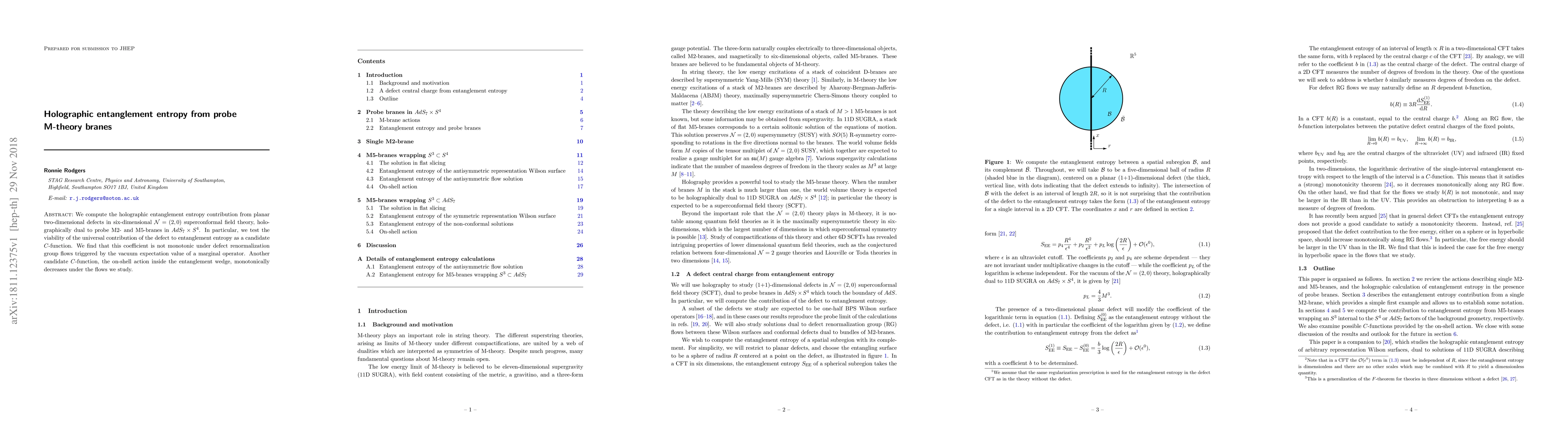 We compute the holographic entanglement entropy contribution from planar two-dimensional defects in six-dimensional $\mathcal{N}=(2,0)$ superconformal field theory, holographically dual to probe M2- and M5-branes in $AdS_7 \times S^4$. In particular, we test the viability of the universal contribution of the defect to entanglement entropy as a candidate $C$-function. We find that this coefficient is not monotonic under defect renormalization group flows triggered by the vacuum expectation value of a marginal operator. Another candidate $C$-function, the on-shell action inside the entanglement wedge, monotonically decreases under the flows we study.