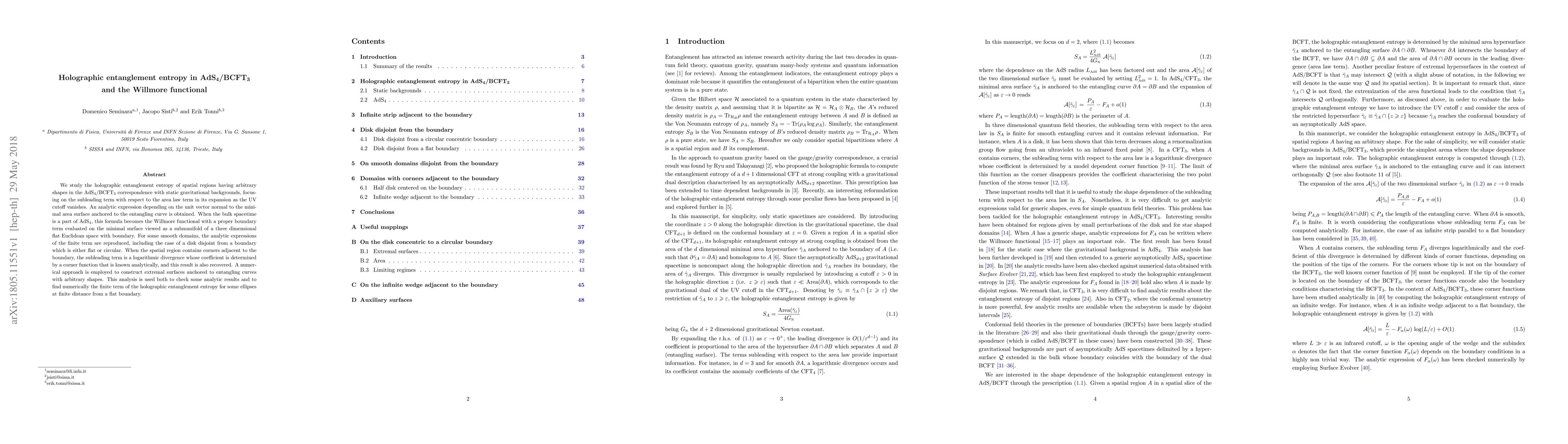 This paper investigates the holographic entanglement entropy in AdS4/BCFT3, focusing on the subleading term and deriving an analytic expression linked to the Willmore functional. It confirms the formula's validity for various smooth domains and corners, employing numerical methods for verification and further exploration.