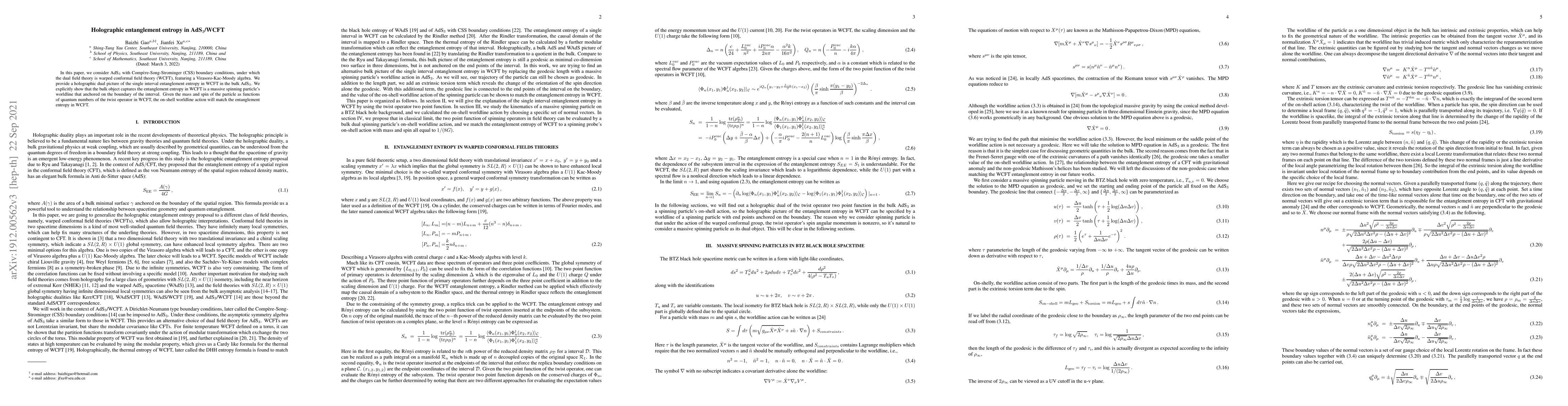 This paper explores the holographic dual of entanglement entropy in AdS$_3$ with CSS boundary conditions, where the dual field theory is WCFT. It demonstrates that the entanglement entropy in WCFT corresponds to a massive spinning particle's worldline anchored on the boundary, with its mass and spin derived from the twist operator's quantum numbers, matching the entanglement entropy via the on-shell worldline action.