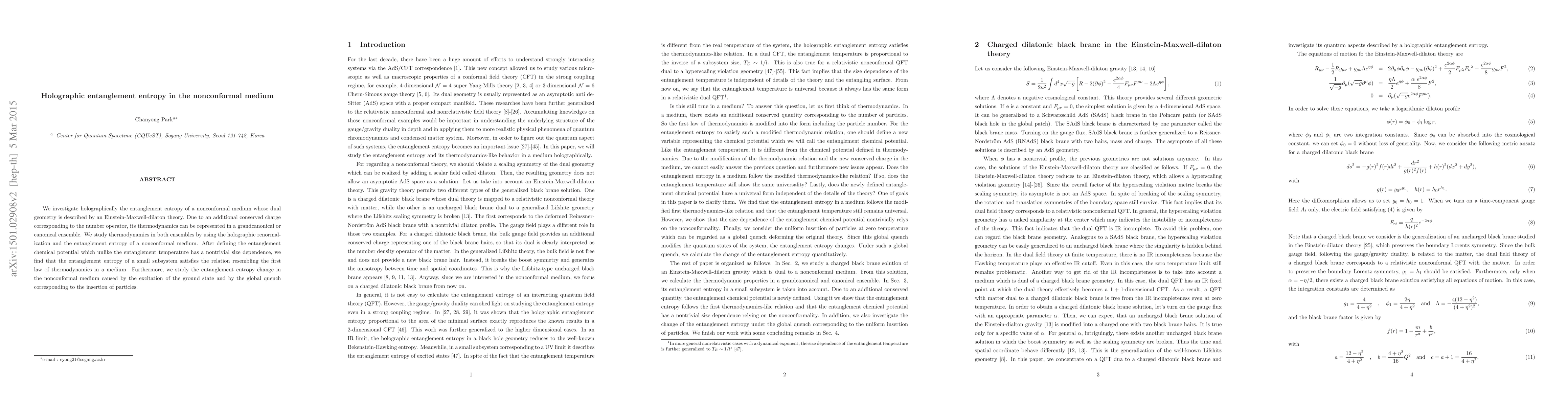 This paper explores the entanglement entropy in a nonconformal medium using holographic methods, focusing on Einstein-Maxwell-dilaton theory. It examines thermodynamics in grandcanonical and canonical ensembles, defining an entanglement chemical potential and finding a relation resembling the first law of thermodynamics. The study also investigates entropy changes due to ground state excitations and global quenches.