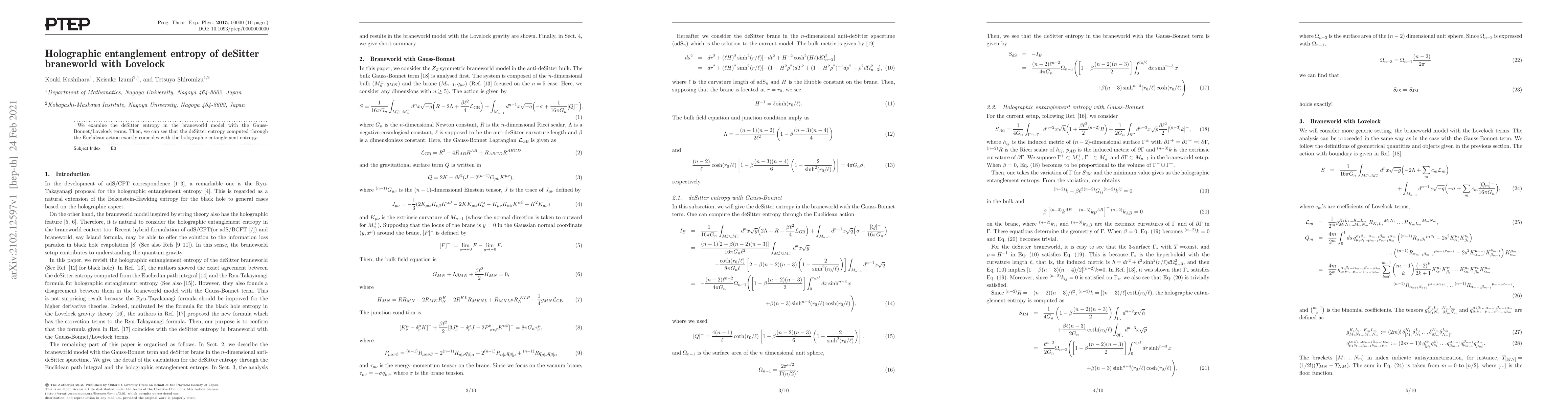We examine the deSitter entropy in the braneworld model with the Gauss-Bonnet/Lovelock terms. Then, we can see that the deSitter entropy computed through the Euclidean action exactly coincides with the holographic entanglement entropy.
