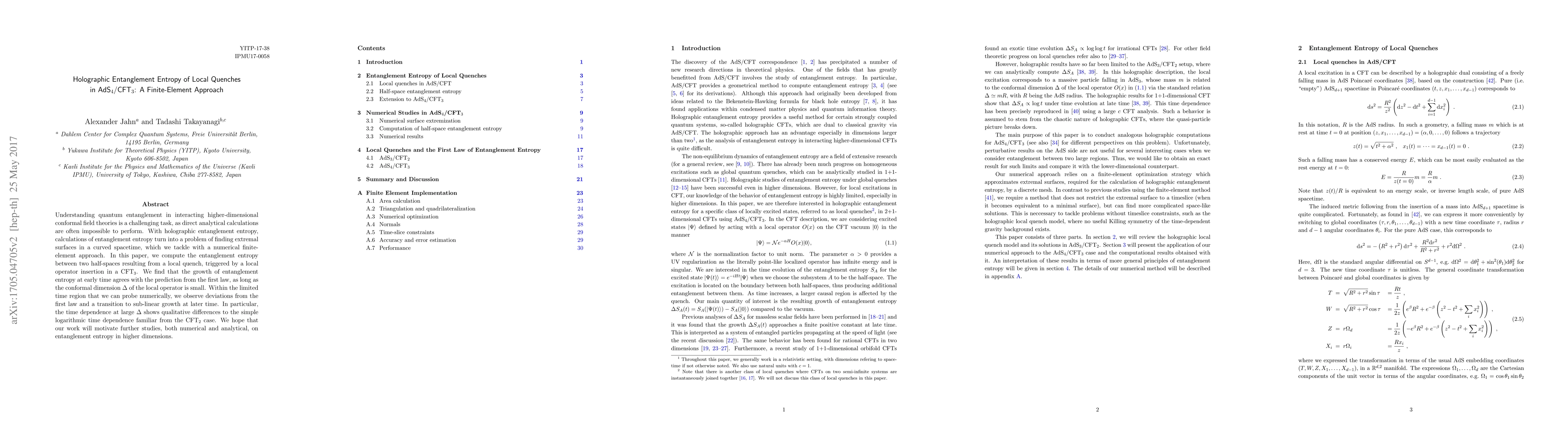 This research employs a numerical finite-element method to calculate entanglement entropy in a holographic setting, specifically for local quenches in AdS4/CFT3. Key findings include early-time agreement with the first law of entanglement entropy, deviations from the first law at later times, and a transition to sub-linear growth. The study reveals that time dependence at larger conformal dimensions shows differences from the logarithmic time dependence in CFT2, suggesting potential for further exploration in both numerical and analytical studies of entanglement entropy in higher dimensions.