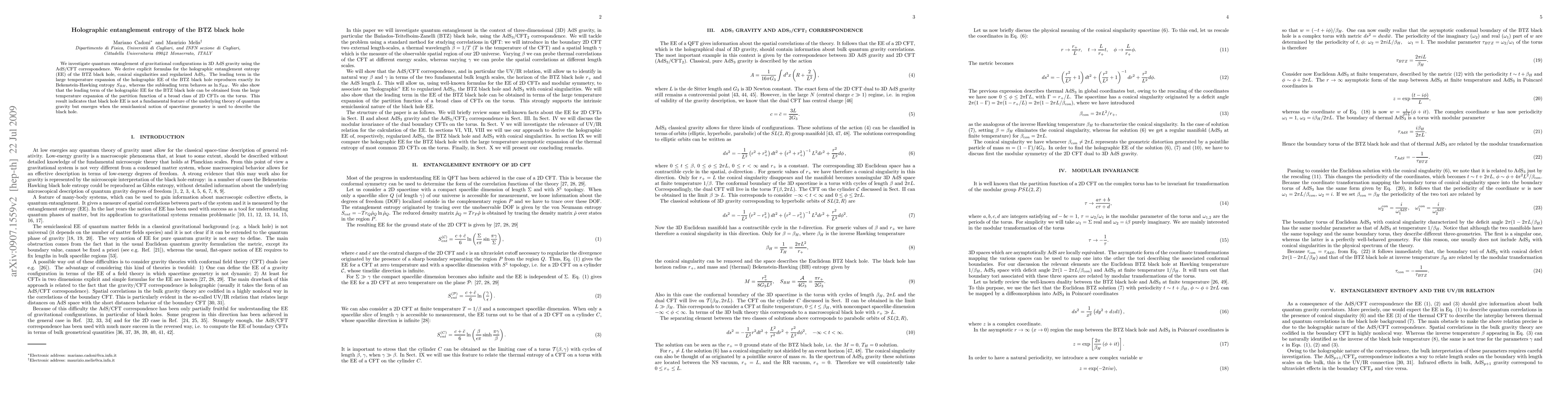 The research investigates quantum entanglement of gravitational configurations in 3D AdS gravity using the AdS/CFT correspondence, deriving explicit formulas for holographic entanglement entropy (EE) of the BTZ black hole, conical singularities, and regularized AdS₃.
