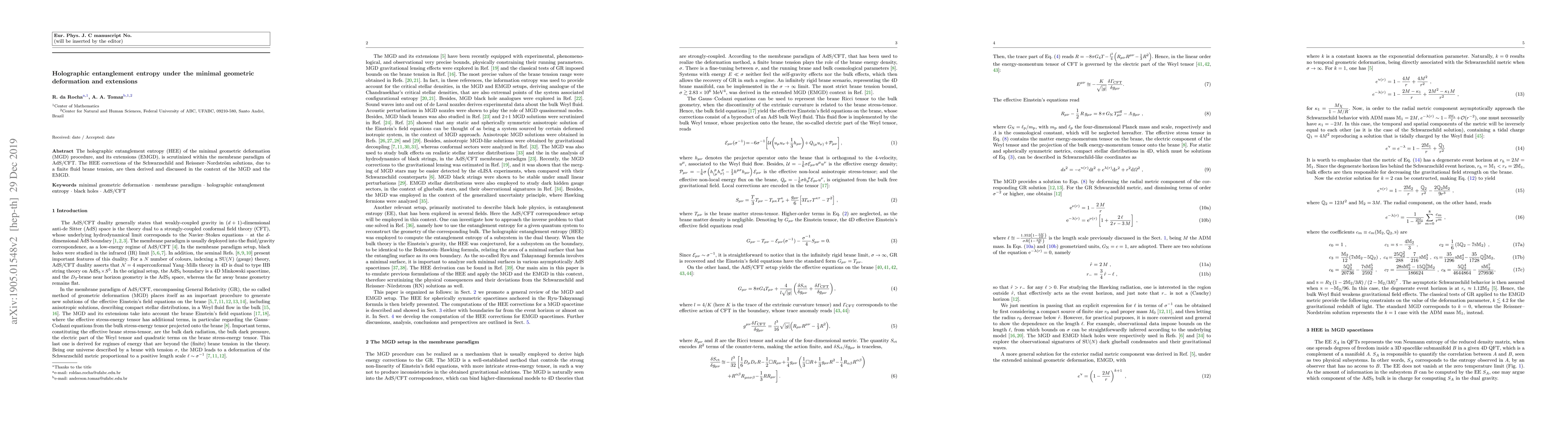 This paper explores holographic entanglement entropy under minimal geometric deformation and its extensions, deriving corrections for Schwarzschild and Reissner-Nordstr"om solutions with finite fluid brane tension.