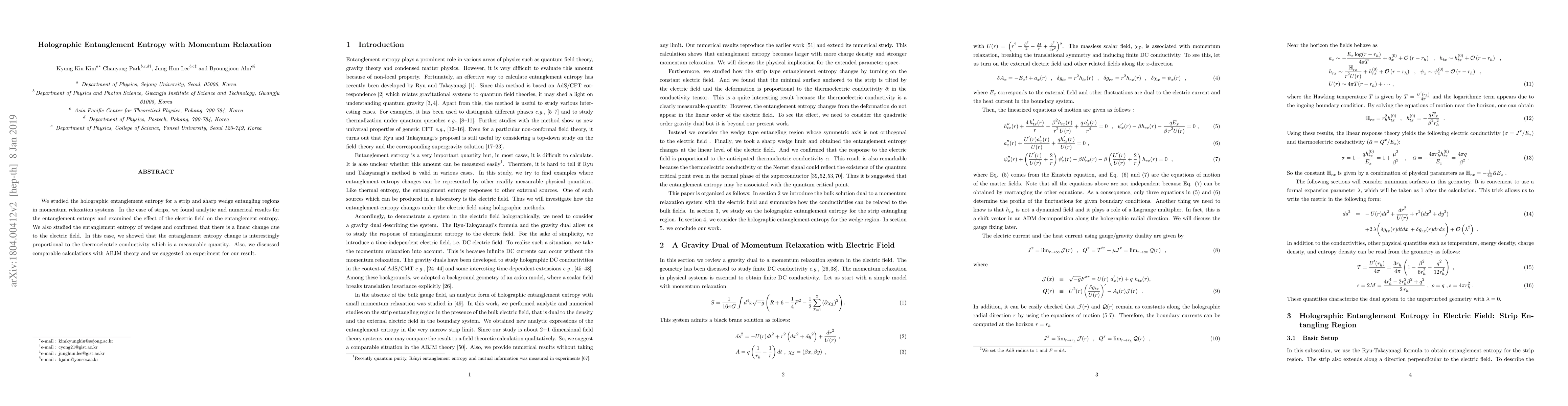 This paper investigates holographic entanglement entropy in momentum relaxation systems for strip and wedge entangling regions, finding analytic and numerical results that show the effect of electric fields on minimal surfaces and a linear relationship between entropy change and thermoelectric conductivity.