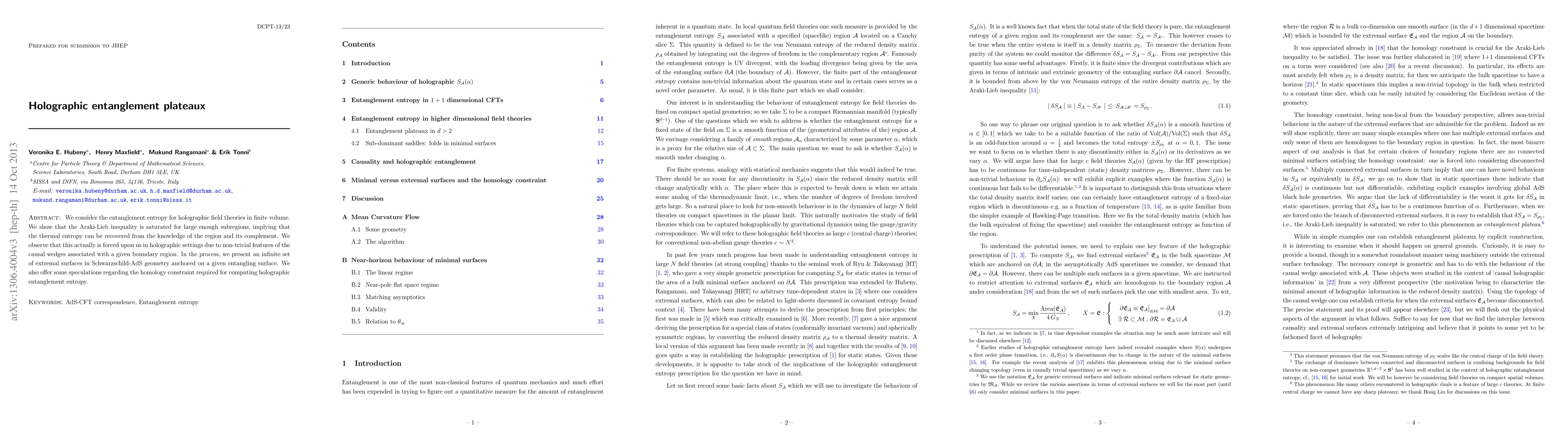 We consider the entanglement entropy for holographic field theories in finite volume. We show that the Araki-Lieb inequality is saturated for large enough subregions, implying that the thermal entropy can be recovered from the knowledge of the region and its complement. We observe that this actually is forced upon us in holographic settings due to non-trivial features of the causal wedges associated with a given boundary region. In the process, we present an infinite set of extremal surfaces in Schwarzschild-AdS geometry anchored on a given entangling surface. We also offer some speculations regarding the homology constraint required for computing holographic entanglement entropy.