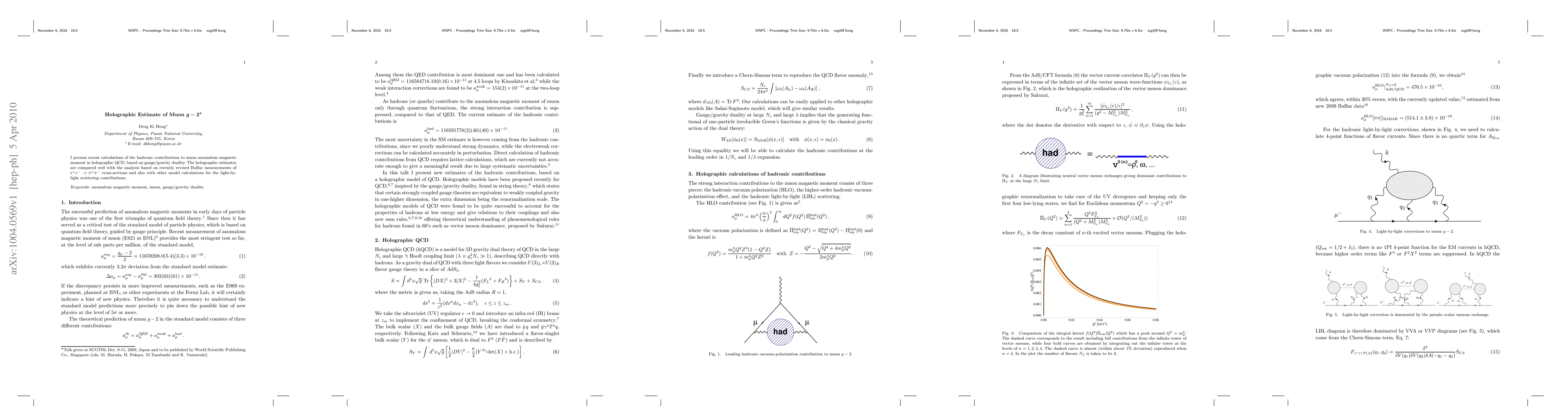 I present recent calculations of the hadronic contributions to muon anomalous magnetic moment in holographic QCD, based on gauge/gravity duality. The holographic estimates are compared well with the analysis based on recently revised BaBar measurements of e+ e- -> pi+ pi- cross-sections and also with other model calculations for the light-by-light scattering contributions.