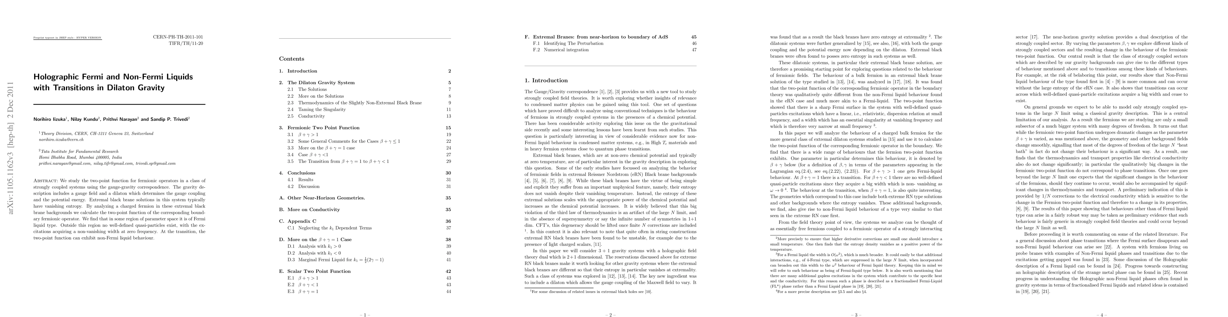 We study the two-point function for fermionic operators in a class of strongly coupled systems using the gauge-gravity correspondence. The gravity description includes a gauge field and a dilaton which determines the gauge coupling and the potential energy. Extremal black brane solutions in this system typically have vanishing entropy. By analyzing a charged fermion in these extremal black brane backgrounds we calculate the two-point function of the corresponding boundary fermionic operator. We find that in some region of parameter space it is of Fermi liquid type. Outside this region no well-defined quasi-particles exist, with the excitations acquiring a non-vanishing width at zero frequency. At the transition, the two-point function can exhibit non-Fermi liquid behaviour.
