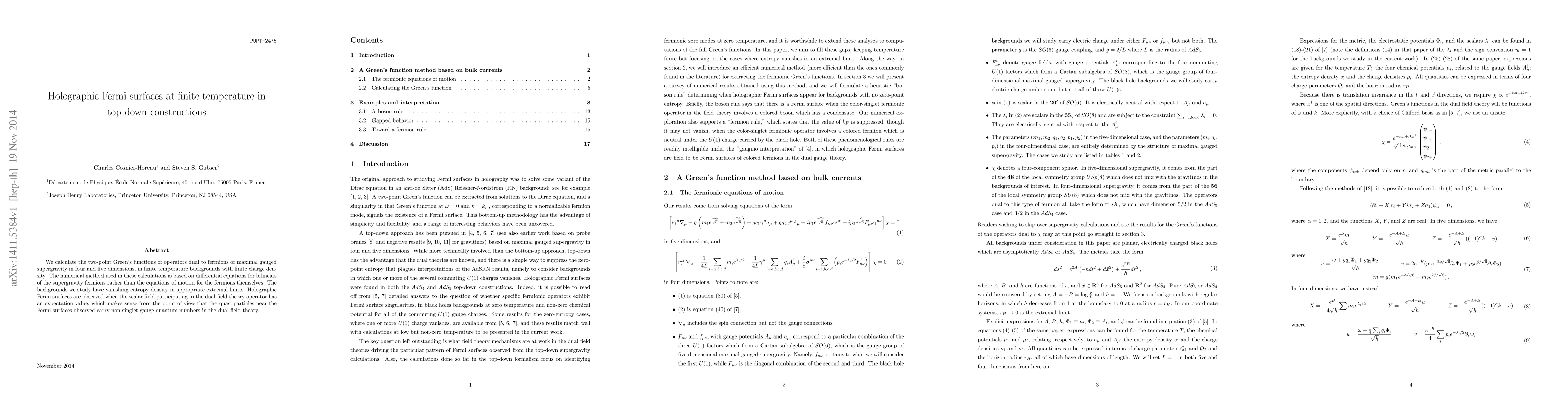 We calculate the two-point Green's functions of operators dual to fermions of maximal gauged supergravity in four and five dimensions, in finite temperature backgrounds with finite charge density. The numerical method used in these calculations is based on differential equations for bilinears of the supergravity fermions rather than the equations of motion for the fermions themselves. The backgrounds we study have vanishing entropy density in appropriate extremal limits. Holographic Fermi surfaces are observed when the scalar field participating in the dual field theory operator has an expectation value, which makes sense from the point of view that the quasi-particles near the Fermi surfaces observed carry non-singlet gauge quantum numbers in the dual field theory.