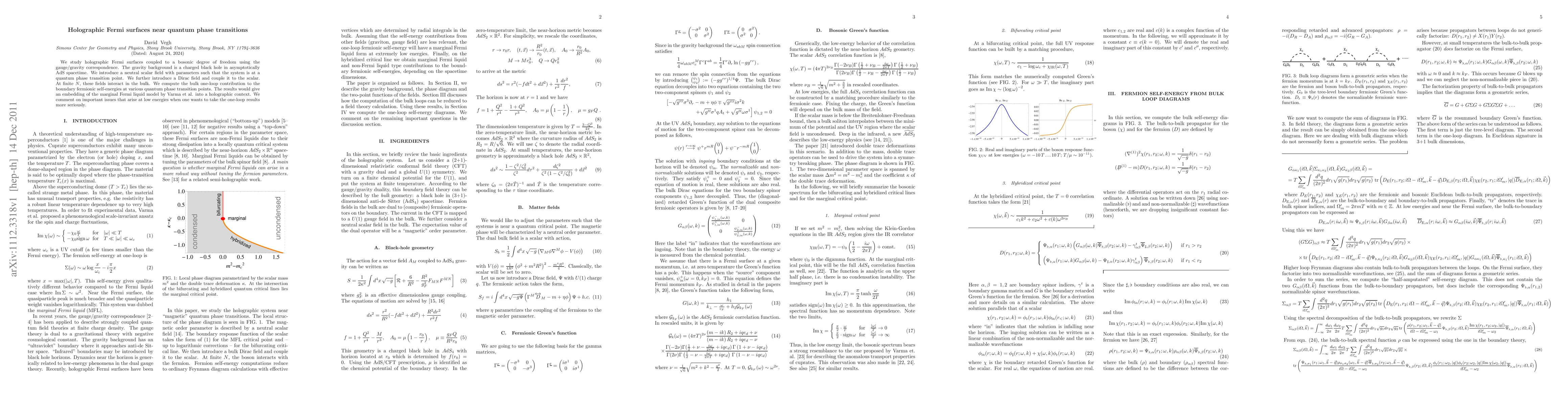 This paper explores holographic Fermi surfaces near quantum phase transitions using the gauge/gravity duality, focusing on a charged black hole in AdS space. It introduces a neutral scalar field and a Dirac field, computing the one-loop contribution to the boundary fermionic self-energies, which provides insights into the marginal Fermi liquid model in a holographic framework.