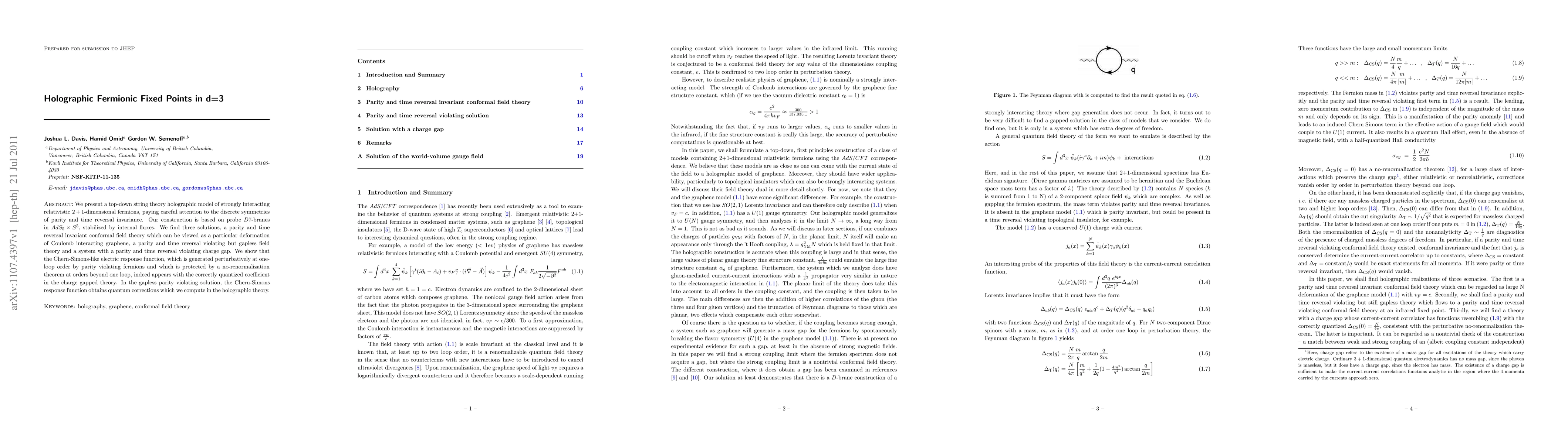 We present a top-down string theory holographic model of strongly interacting relativistic 2+1-dimensional fermions, paying careful attention to the discrete symmetries of parity and time reversal invariance. Our construction is based on probe $D7$-branes in $AdS_5 \times S^5$, stabilized by internal fluxes. We find three solutions, a parity and time reversal invariant conformal field theory which can be viewed as a particular deformation of Coulomb interacting graphene, a parity and time reversal violating but gapless field theory and a system with a parity and time reversal violating charge gap. We show that the Chern-Simons-like electric response function, which is generated perturbatively at one-loop order by parity violating fermions and which is protected by a no-renormalization theorem at orders beyond one loop, indeed appears with the correctly quantized coefficient in the charge gapped theory. In the gapless parity violating solution, the Chern-Simons response function obtains quantum corrections which we compute in the holographic theory.