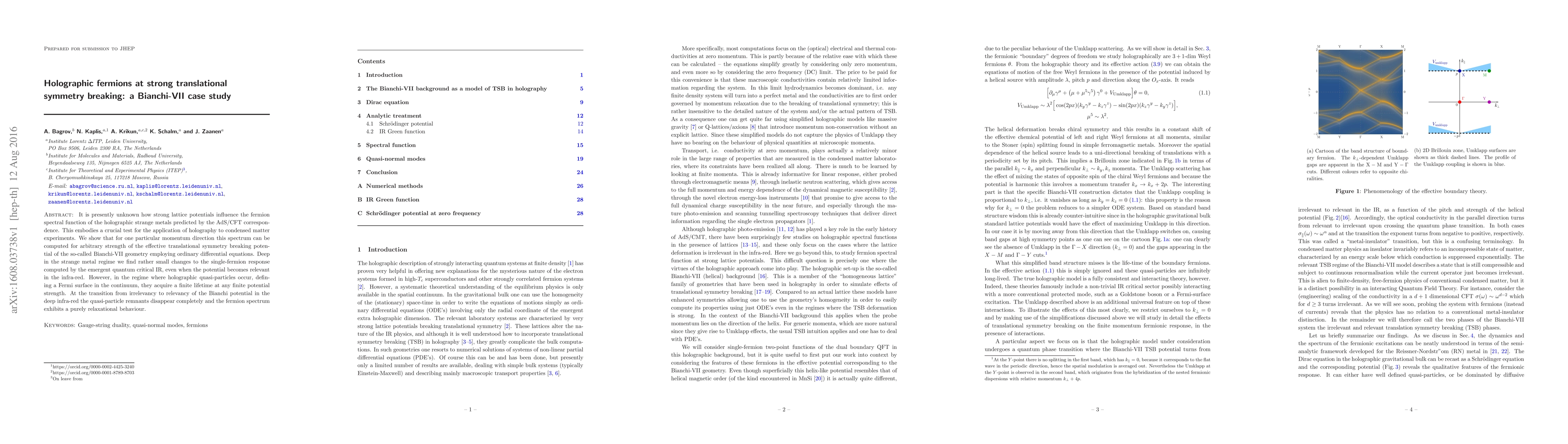 It is presently unknown how strong lattice potentials influence the fermion spectral function of the holographic strange metals predicted by the AdS/CFT correspondence. This embodies a crucial test for the application of holography to condensed matter experiments. We show that for one particular momentum direction this spectrum can be computed for arbitrary strength of the effective translational symmetry breaking potential of the so-called Bianchi-VII geometry employing ordinary differential equations. Deep in the strange metal regime we find rather small changes to the single-fermion response computed by the emergent quantum critical IR, even when the potential becomes relevant in the infra-red. However, in the regime where holographic quasi-particles occur, defining a Fermi surface in the continuum, they acquire a finite lifetime at any finite potential strength. At the transition from irrelevancy to relevancy of the Bianchi potential in the deep infra-red the quasi-particle remnants disappear completely and the fermion spectrum exhibits a purely relaxational behaviour.