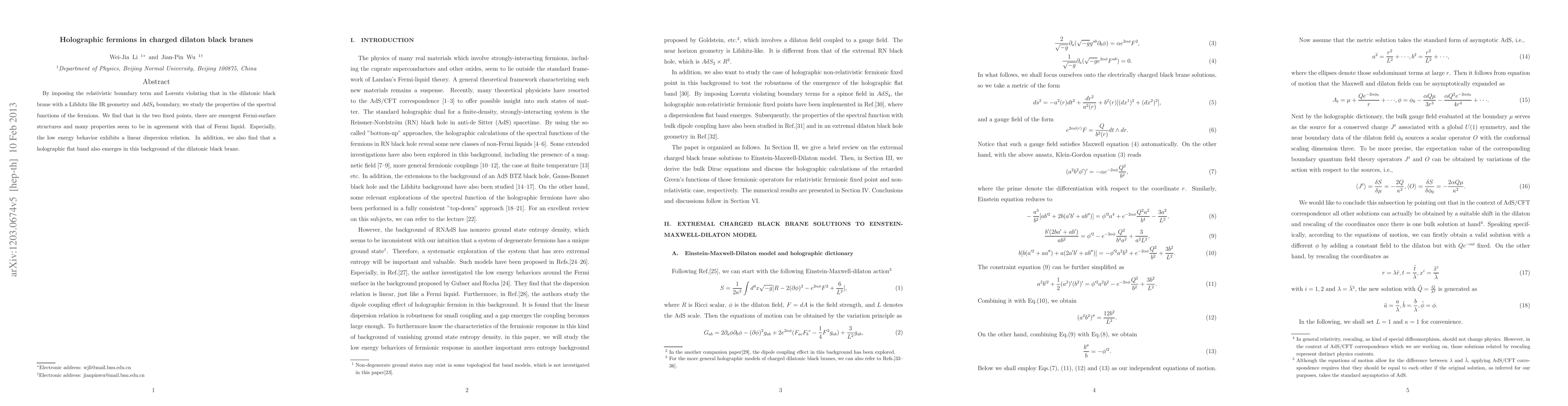 By imposing the relativistic boundary term and Lorentz violating that in the dilatonic black brane with a Lifshitz like IR geometry and $AdS_4$ boundary, we study the properties of the spectral functions of the fermions. We find that in the two fixed points, there are emergent Fermi-surface structures and many properties seem to be in agreement with that of Fermi liquid. Especially, the low energy behavior exhibits a linear dispersion relation. In addition, we also find that a holographic flat band also emerges in this background of the dilatonic black brane.