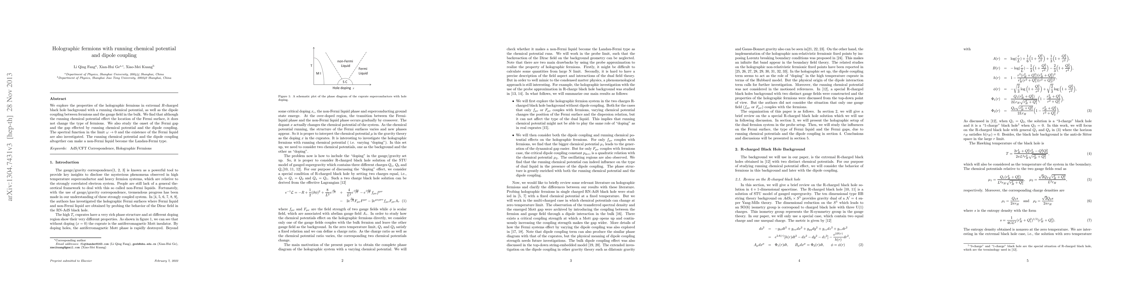 This paper investigates holographic fermions in an extremal black hole background with a running chemical potential and dipole coupling, finding that these factors affect the Fermi surface and gap but do not change the fermion type. It concludes that the combination of these effects can transform a non-Fermi liquid into a Landau-Fermi liquid.