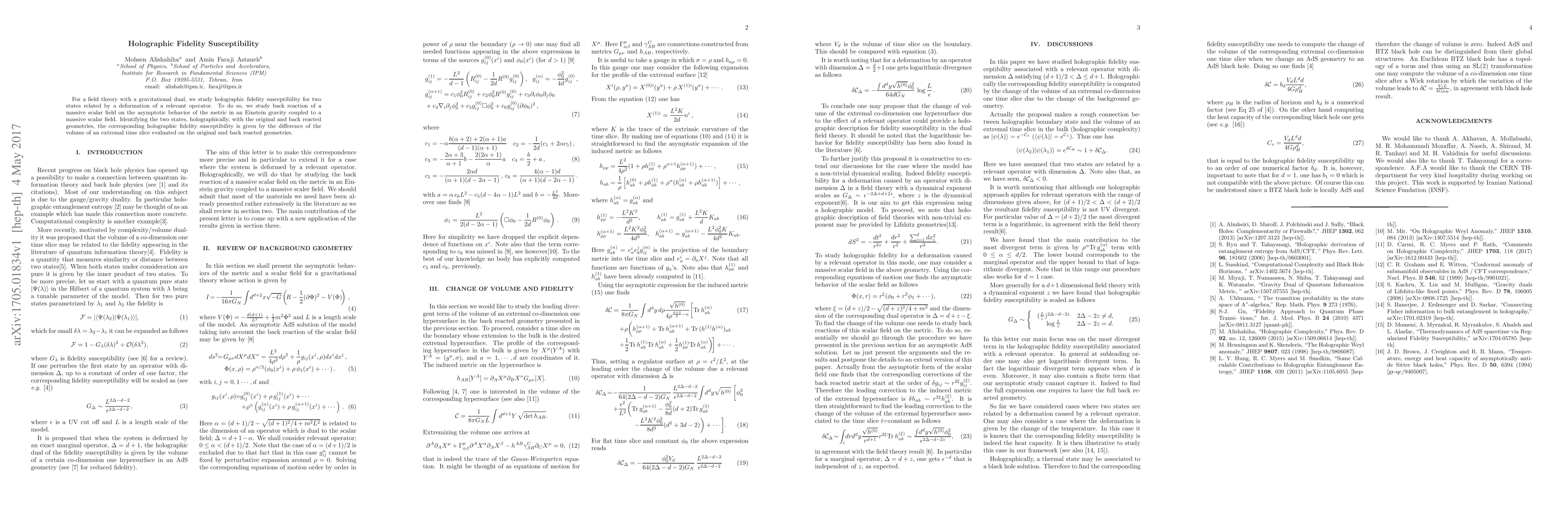 This paper investigates holographic fidelity susceptibility in a field theory with a gravitational dual, focusing on two states connected by a relevant operator deformation. It examines the back reaction of a massive scalar field on the metric in Einstein gravity, determining the fidelity susceptibility through the difference in volumes of extremal time slices in the original and back-reacted geometries.