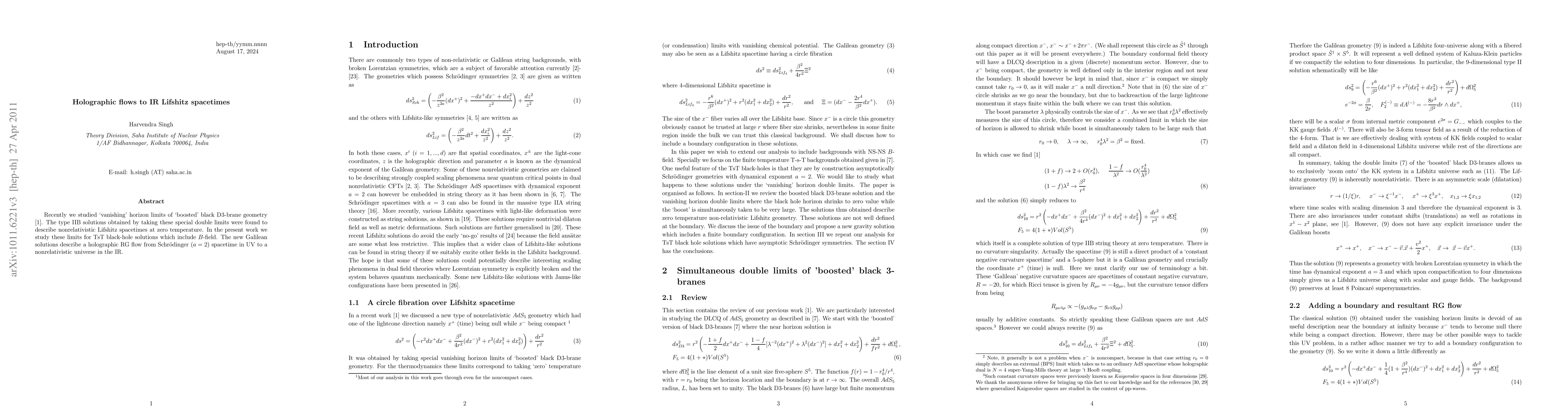 Recently we studied `vanishing' horizon limits of `boosted' black D3-brane geometry \cite{hsnr}. The type IIB solutions obtained by taking these special double limits were found to describe nonrelativistic Lifshitz spacetimes at zero temperature. In the present work we study these limits for TsT black-hole solutions which include $B$-field. The new Galilean solutions describe a holographic RG flow from Schr\"odinger ($a=2$) spacetime in UV to a Lifshitz universe ($a=3$) in the IR.