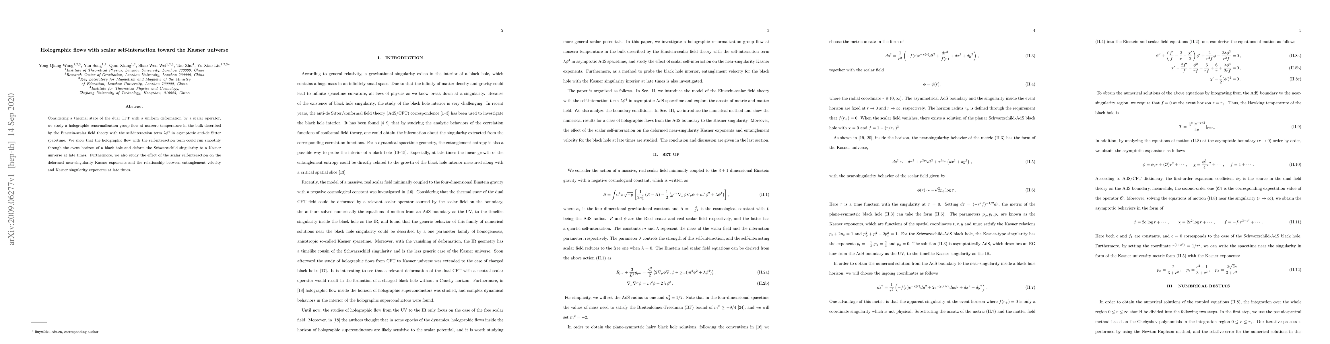 Considering a thermal state of the dual CFT with a uniform deformation by a scalar operator, we study a holographic renormalization group flow at nonzero temperature in the bulk described by the Einstein-scalar field theory with the self-interaction term $\lambda \phi^4$ in asymptotic anti-de Sitter spacetime. We show that the holographic flow with the self-interaction term could run smoothly through the event horizon of a black hole and deform the Schwarzschild singularity to a Kasner universe at late times. Furthermore, we also study the effect of the scalar self-interaction on the deformed near-singularity Kasner exponents and the relationship between entanglement velocity and Kasner singularity exponents at late times.