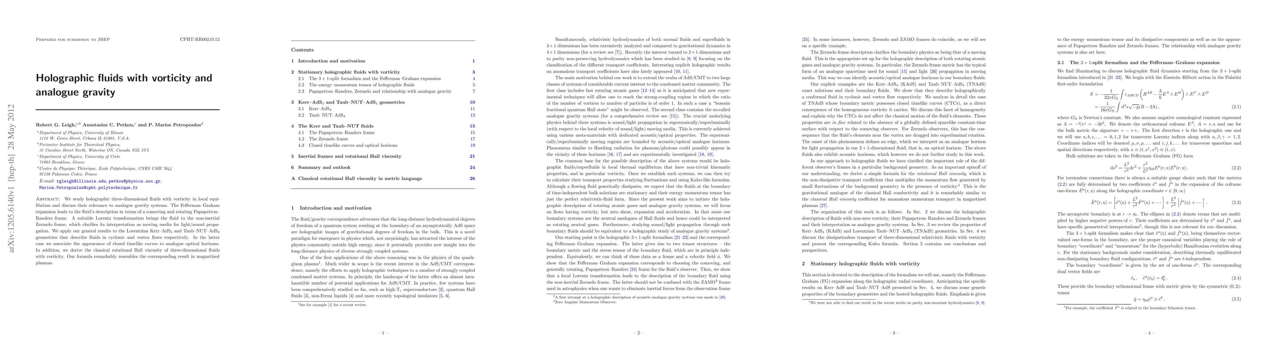 This paper investigates holographic three-dimensional fluids with vorticity in local equilibrium, applying the Fefferman-Graham expansion to describe them in a rotating frame. It also connects these fluids to analogue gravity systems, particularly focusing on cyclonic and vortex flows in Kerr-AdS_4 and Taub-NUT-AdS_4 geometries, and derives the classical rotational Hall viscosity.