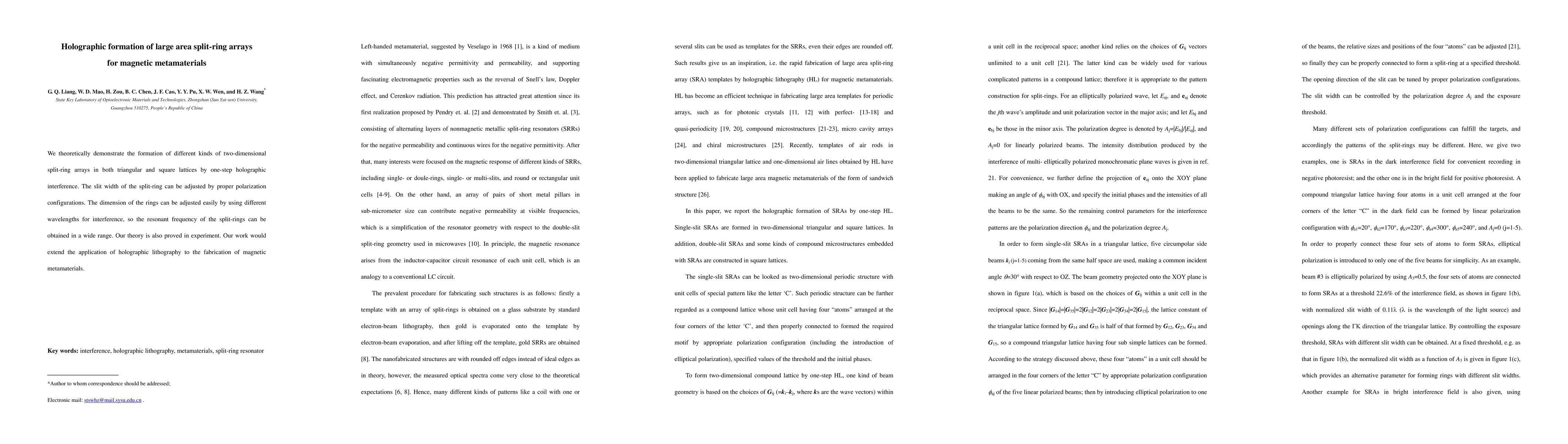 This paper presents a theoretical and experimental demonstration of holographic interference for creating large area split-ring arrays in triangular and square lattices, with adjustable slit widths and resonant frequencies via polarization and wavelength variations. This method extends the application of holographic lithography in fabricating magnetic metamaterials.