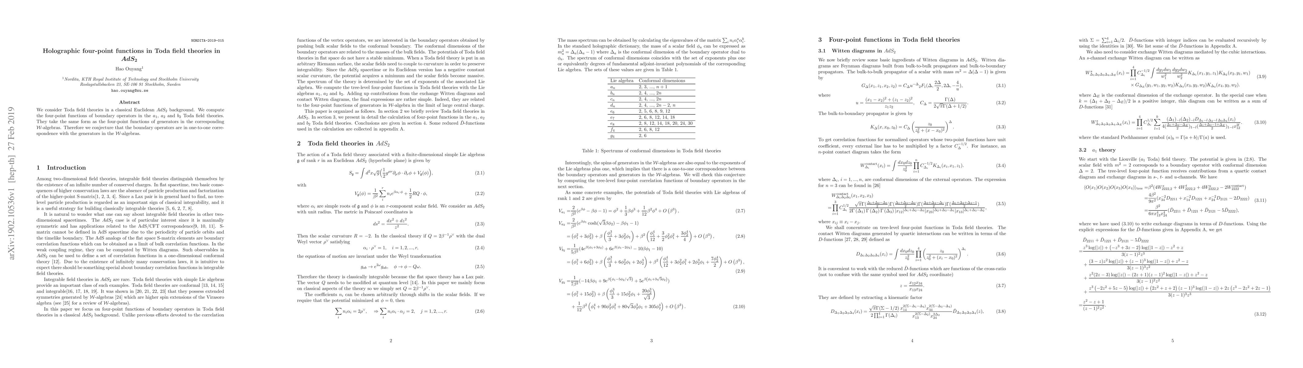 We consider Toda field theories in a classical Euclidean $AdS_2$ background. We compute the four-point functions of boundary operators in the $a_1$, $a_2$ and $b_2$ Toda field theories. They take the same form as the four-point functions of generators in the corresponding $\mathcal{W}$-algebras. Therefore we conjecture that the boundary operators are in one-to-one correspondence with the generators in the $\mathcal{W}$-algebras.