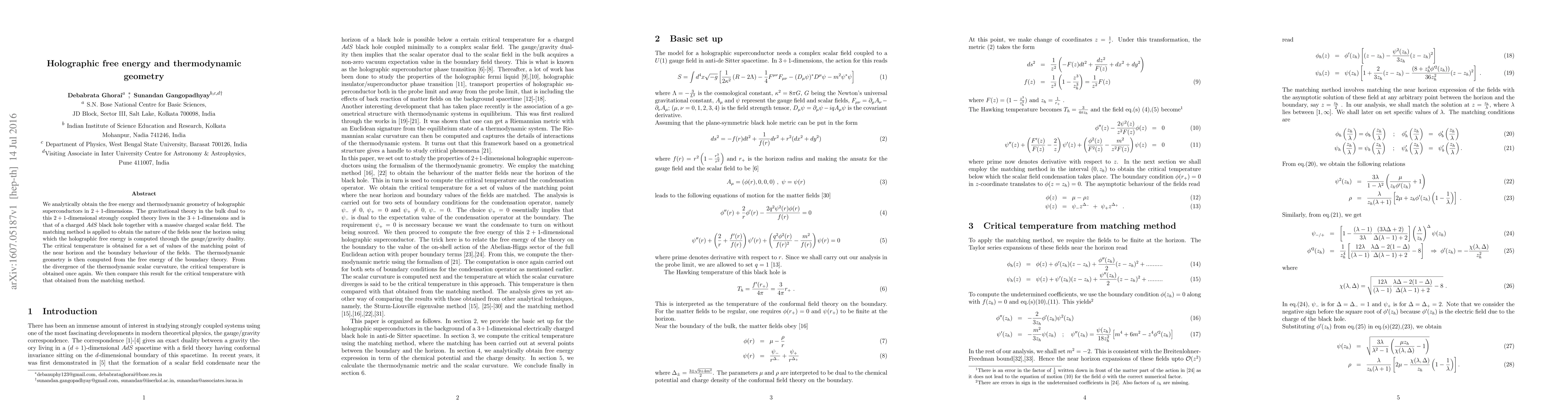 We analytically obtain the free energy and thermodynamic geometry of holographic superconductors in $2+1$-dimensions. The gravitational theory in the bulk dual to this $2+1$-dimensional strongly coupled theory lives in the $3+1$-dimensions and is that of a charged $AdS$ black hole together with a massive charged scalar field. The matching method is applied to obtain the nature of the fields near the horizon using which the holographic free energy is computed through the gauge/gravity duality. The critical temperature is obtained for a set of values of the matching point of the near horizon and the boundary behaviour of the fields. The thermodynamic geometry is then computed from the free energy of the boundary theory. From the divergence of the thermodynamic scalar curvature, the critical temperature is obtained once again. We then compare this result for the critical temperature with that obtained from the matching method.