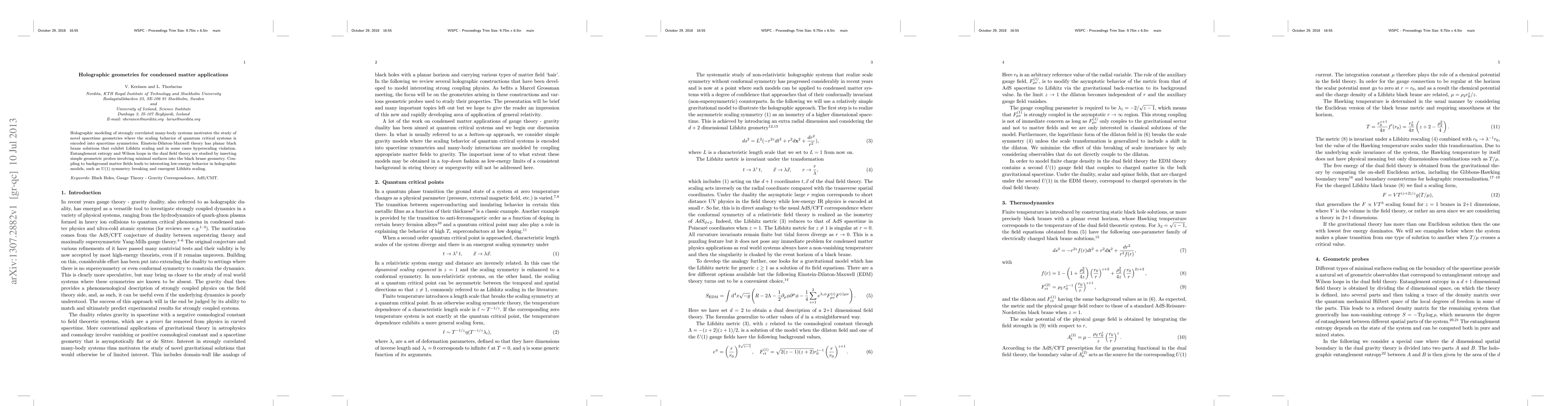 The paper presents novel holographic geometries and their implications for condensed matter systems, including the study of entanglement entropy and Wilson loops using geometric probes.