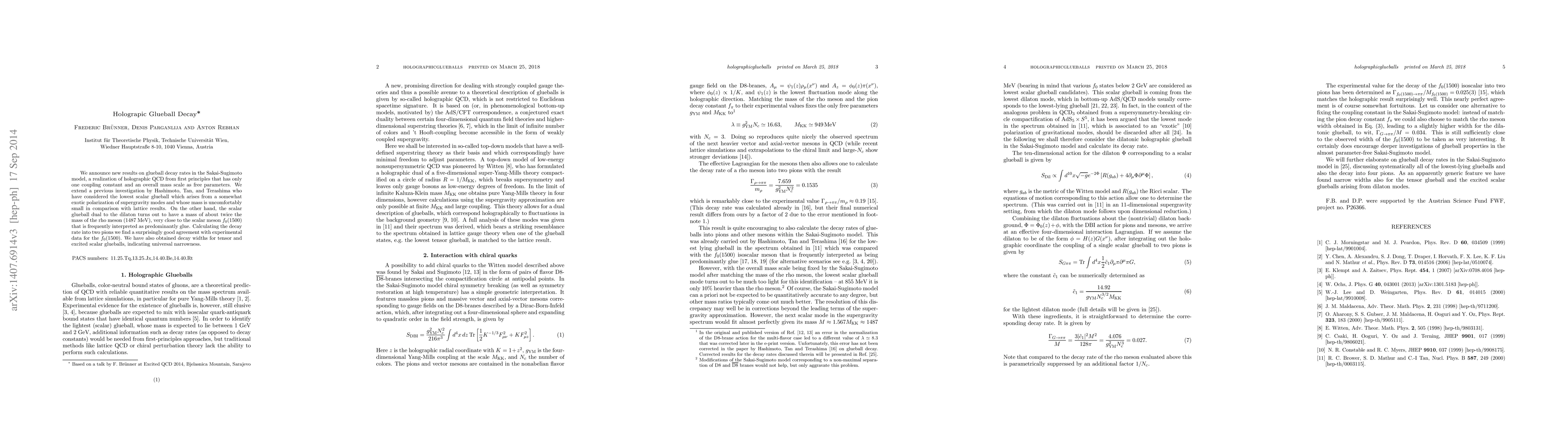 We announce new results on glueball decay rates in the Sakai-Sugimoto model, a realization of holographic QCD from first principles that has only one coupling constant and an overall mass scale as free parameters. We extend a previous investigation by Hashimoto, Tan, and Terashima who have considered the lowest scalar glueball which arises from a somewhat exotic polarization of supergravity modes and whose mass is uncomfortably small in comparison with lattice results. On the other hand, the scalar glueball dual to the dilaton turns out to have a mass of about twice the mass of the rho meson (1487 MeV), very close to the scalar meson $f_0(1500)$ that is frequently interpreted as predominantly glue. Calculating the decay rate into two pions we find a surprisingly good agreement with experimental data for the $f_0(1500)$. We have also obtained decay widths for tensor and excited scalar glueballs, indicating universal narrowness.