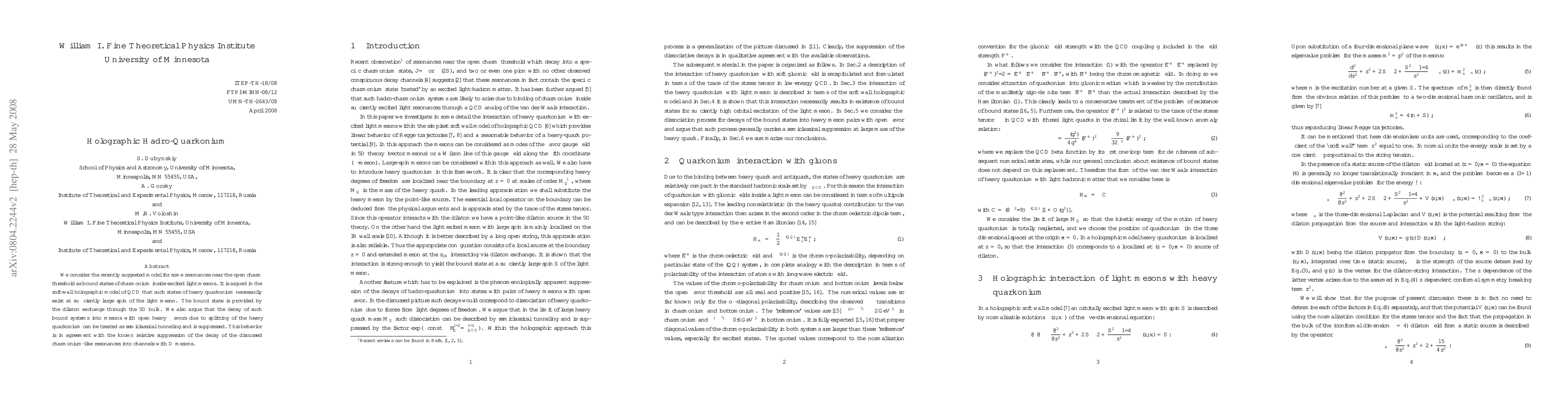 We consider the recently suggested model for some resonances near the open charm threshold as bound states of charmonium inside excited light mesons. It is argued in the soft-wall holographic model of QCD that such states of heavy quarkonium necessarily exist at sufficiently large spin of the light meson. The bound state is provided by the dilaton exchange through the 5D bulk. We also argue that the decay of such bound systems into mesons with open heavy flavors due to splitting of the heavy quarkonium can be treated as semiclassical tunneling and is suppressed. This behavior is in agreement with the known relative suppression of the decay of the discussed charmonium-like resonances into channels with D mesons.