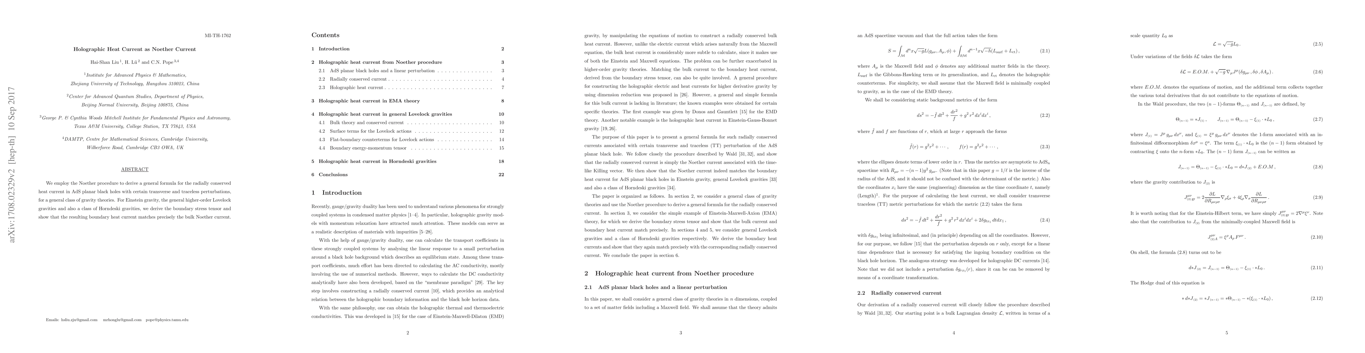 This paper derives a conserved heat current formula for AdS planar black holes using the Noether procedure, applicable to Einstein gravity, higher-order Lovelock gravities, and Horndeski gravities, showing that the boundary heat current aligns with the bulk Noether current.
