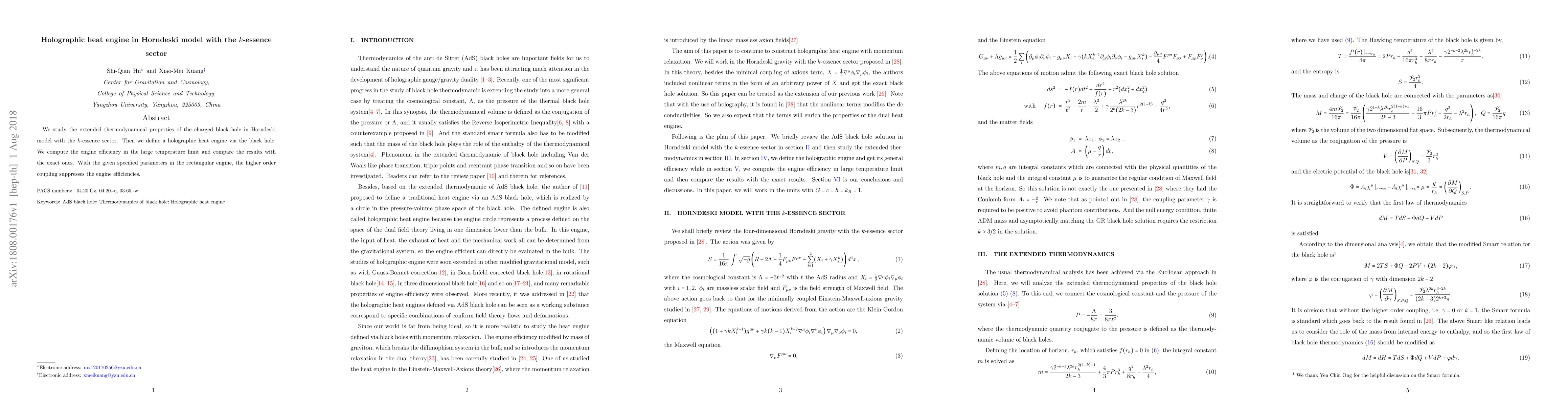 This paper investigates the thermodynamic properties of a charged black hole in the Horndeski model with $k$-essence, defining a holographic heat engine through it. The study finds that the efficiency of the engine decreases with higher-order coupling parameters, contrasting with exact results.
