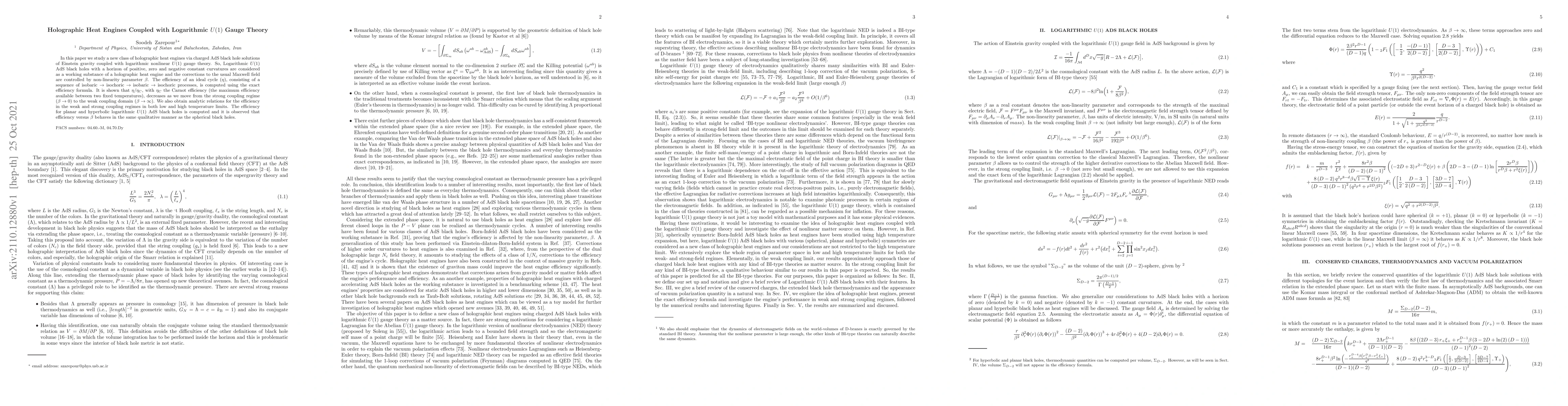 Researchers explore a new type of holographic heat engine that uses charged AdS black holes with logarithmic U(1) gauge theory, finding efficiency decreases from strong to weak coupling regimes.