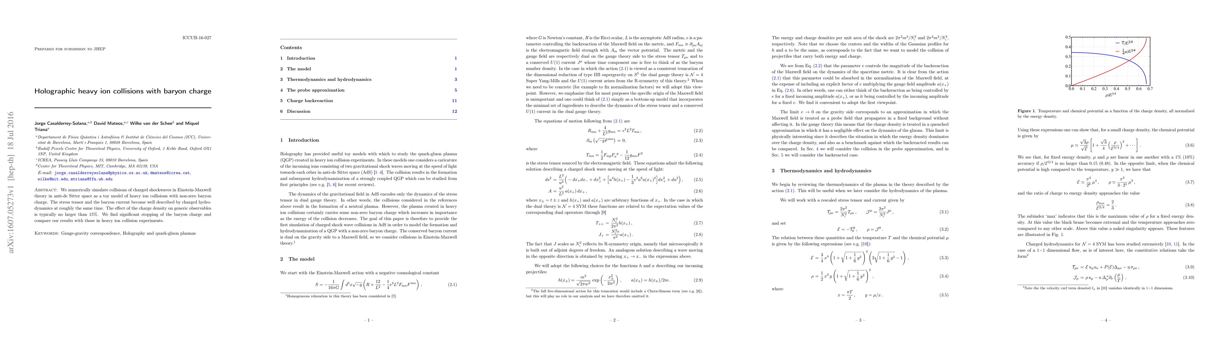 This paper simulates charged shockwave collisions in Einstein-Maxwell theory to model heavy ion collisions with baryon charge. The study finds that charged hydrodynamics describes the stress tensor and baryon current, with charge density effects on observables typically under 15%. The baryon charge profile shows significant stopping compared to energy density profiles.