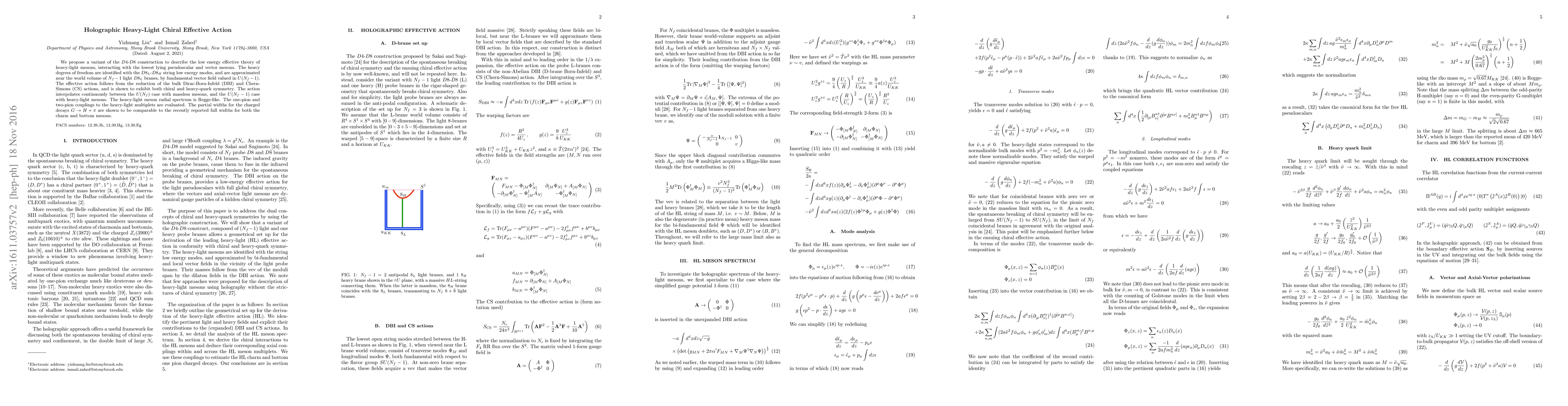 We propose a variant of the $D4$-$D8$ construction to describe the low energy effective theory of heavy-light mesons, interacting with the lowest lying pseudoscalar and vector mesons. The heavy degrees of freedom are identified with the $D8_L$-$D8_H$ string low energy modes, and are approximated near the world volume of $N_f-1$ light $D8_L$ branes, by fundamental vector field valued in $U(N_f-1)$. The effective action follows from the reduction of the bulk D-brane Born-Infeld (DBI) and Chern-Simons (CS) actions, and is shown to exhibit both chiral and heavy-quark symmetry. The action interpolates continuously between the $U(N_f)$ case with massless mesons, and the $U(N_f-1)$ case with heavy-light mesons. The heavy-light meson radial spectrum is Regge-like. The one-pion and two-pion couplings to the heavy-light multiplets are evaluated. The partial widths for the charged decays $G\rightarrow H+\pi$ are shown to be comparable to the recently reported full widths for both the charm and bottom mesons.